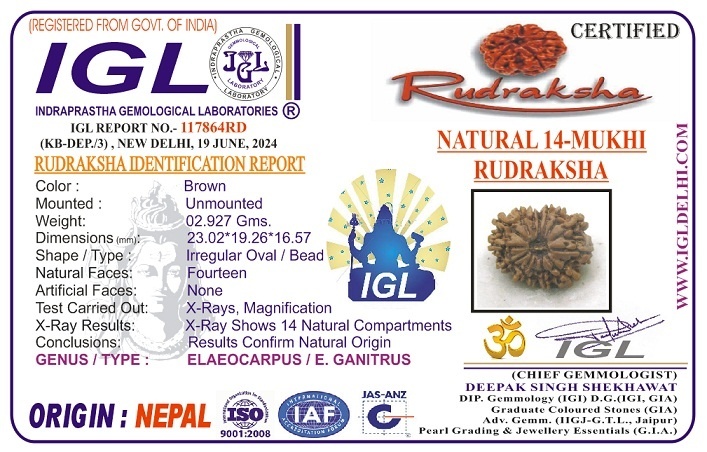 Rituals for wearing : Fourteen faced Rudraksha should be capped in gold or silver and stringed in red thread and wear in neck or be kept on the worshipping place chanting the mantra.