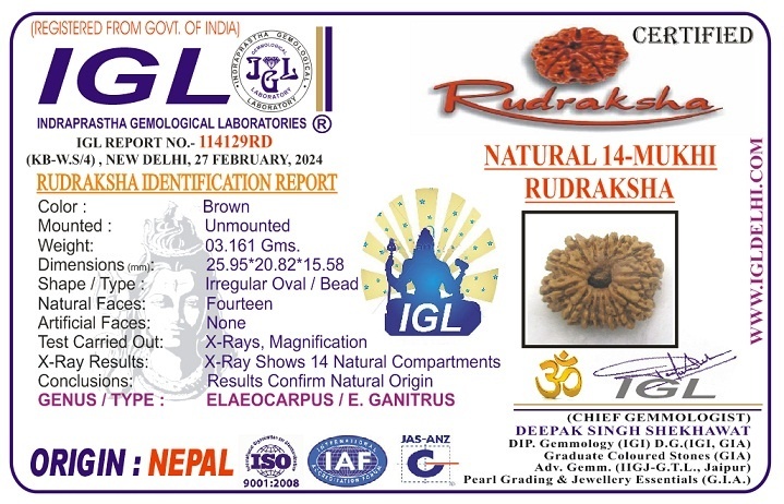 Rituals for wearing : Fourteen faced Rudraksha should be capped in gold or silver and stringed in red thread and wear in neck or be kept on the worshipping place chanting the mantra.