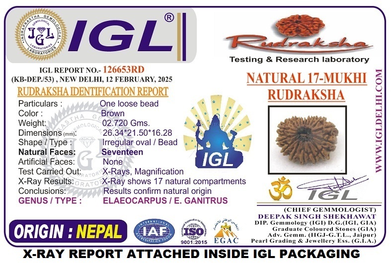 Seventeen Mukhi Rudraksha is very beneficial for project leaders , business man , political leadres & people desiring growth in carrer . This Rudraksha blesses wearer with immense power of creation of wealth & divine magnetism .It gives fulfillment of all desires related to getting a life partner , good luck & prosperity