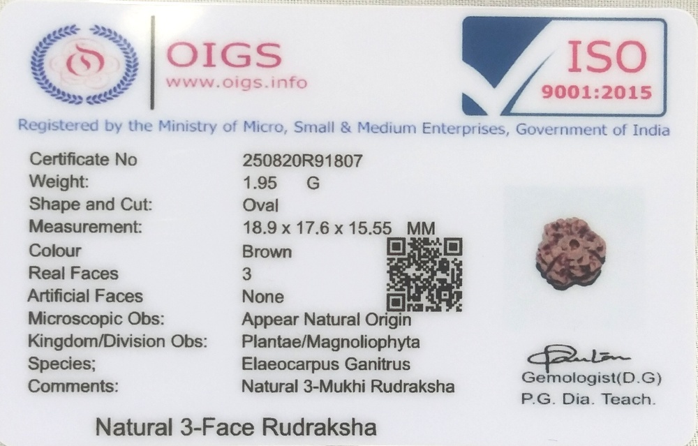 3 Mukhi Rudraksha with Three Complete Seeds – 18.90 mm – Nepal