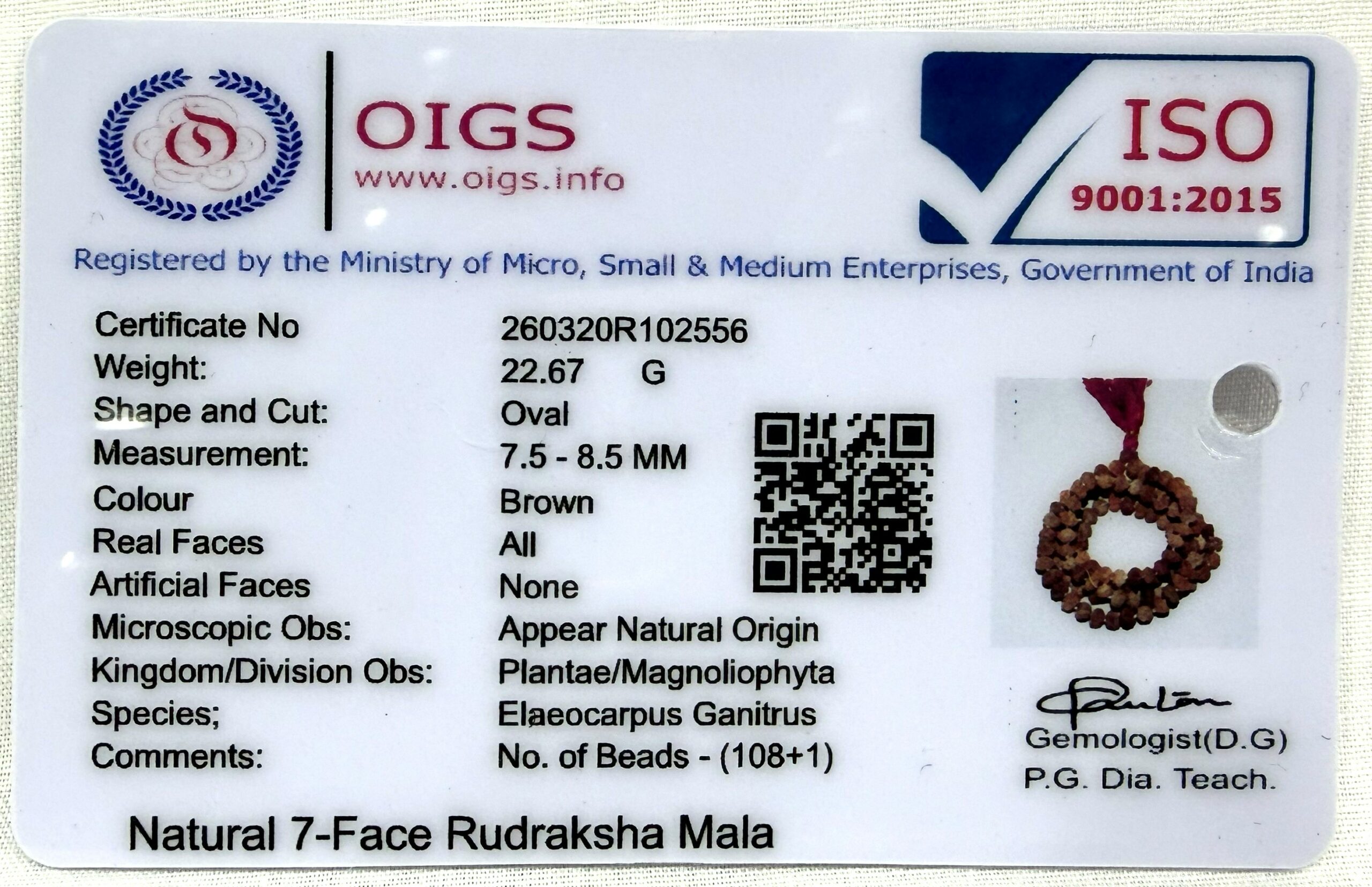 Design : 108+1 beads of high quality selected 7 mukhi rudraksha of Java origin strung in strong thread having traditional knots between beads .
