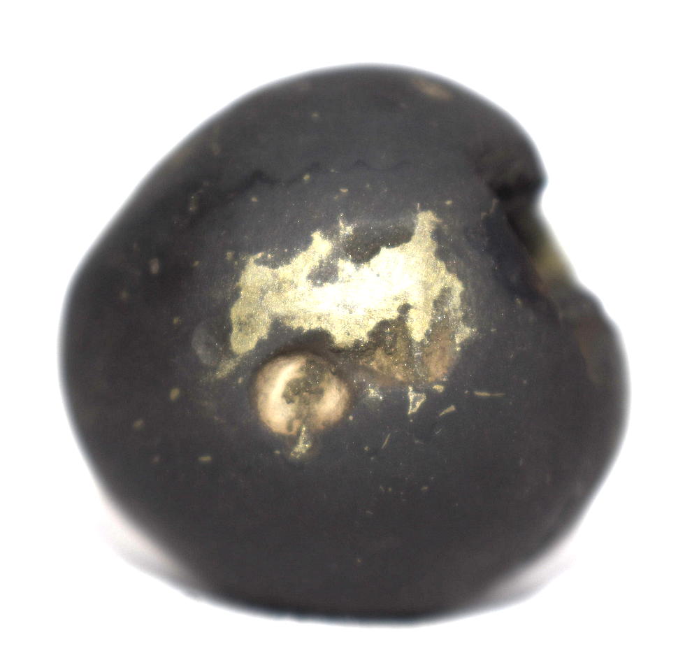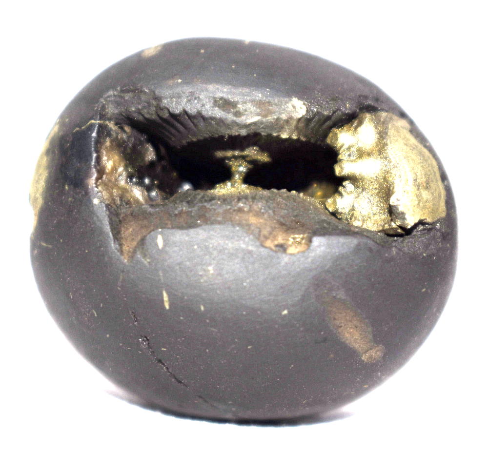 Lion Like Face , Black color with reedish tinge smooth body , big opening having 2 clear chakras , with lot of golden colot , golden color fang marks, and other marks .