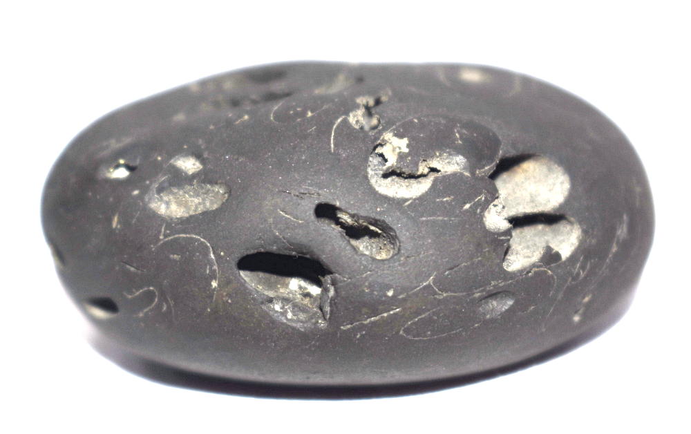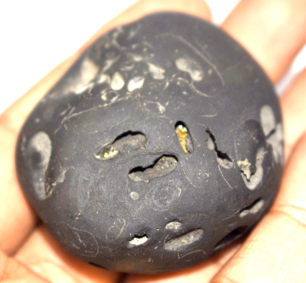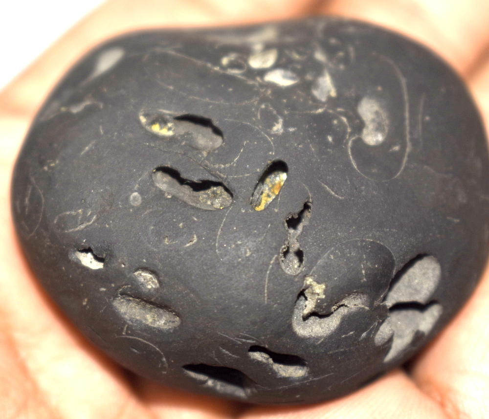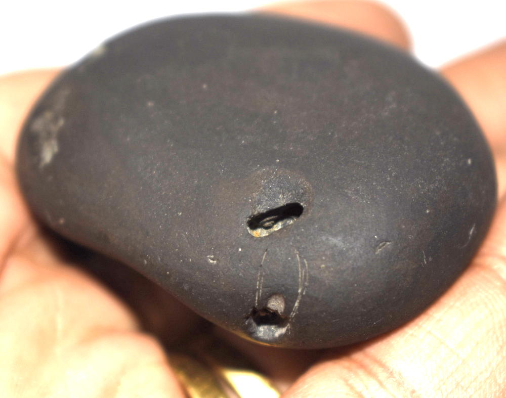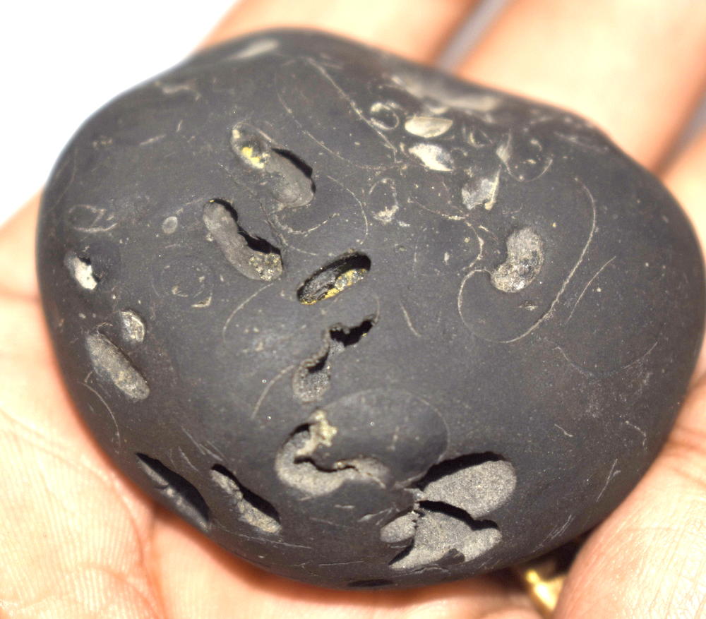 Black color Small body , 7 small opening having 2 chakras in each , with 3 single chakras , mark of lotus , mark of snake ,shankha , flag , kundala , umbrella