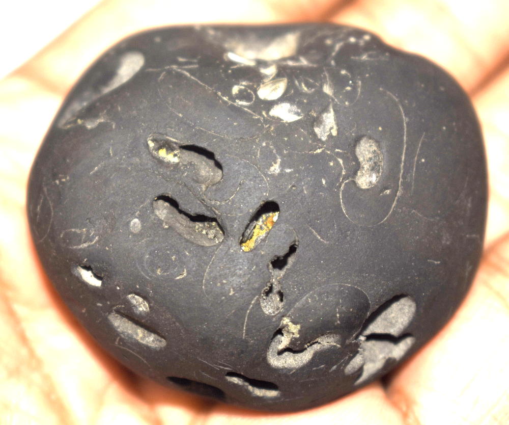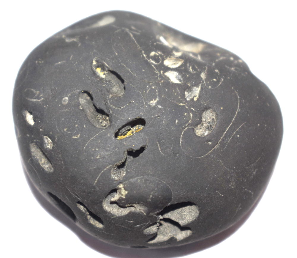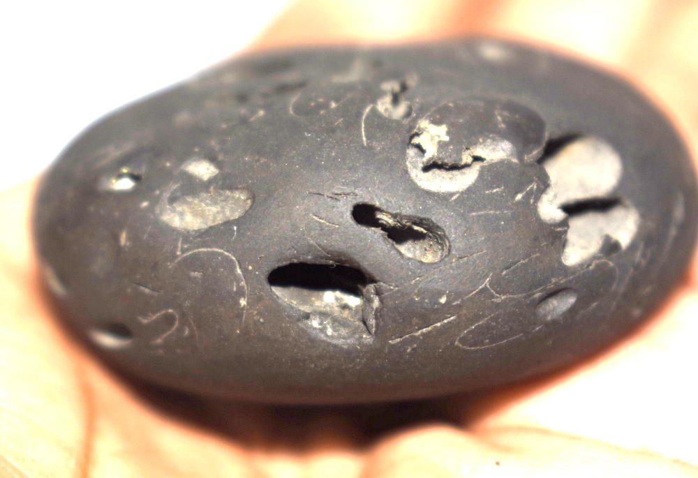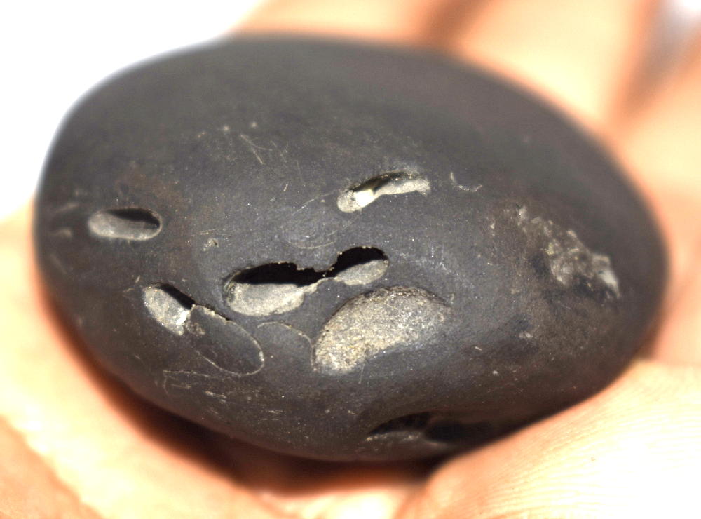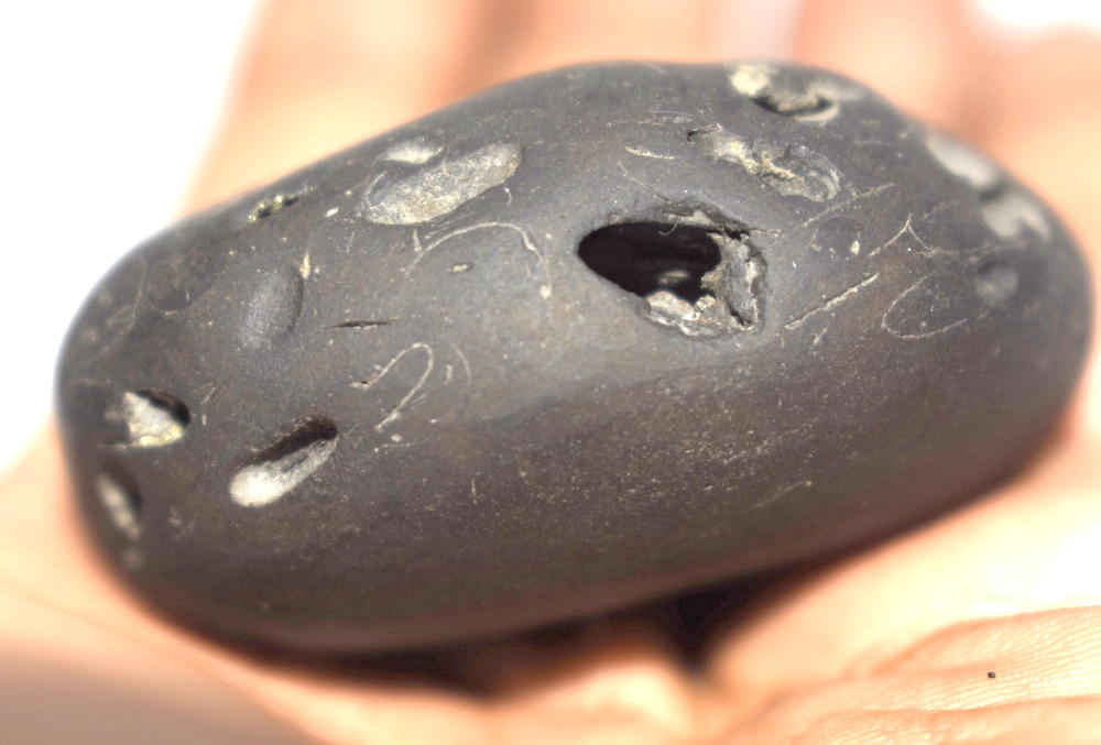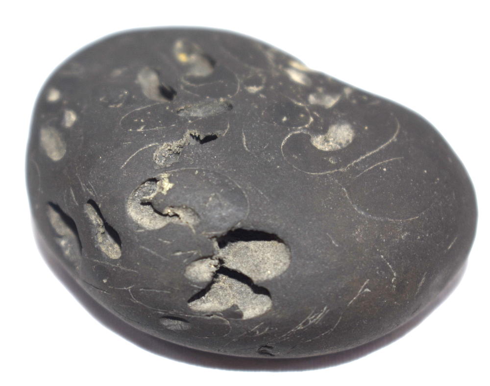 Black color Small body , 7 small opening having 2 chakras in each , with 3 single chakras , mark of lotus , mark of snake ,shankha , flag , kundala , umbrella