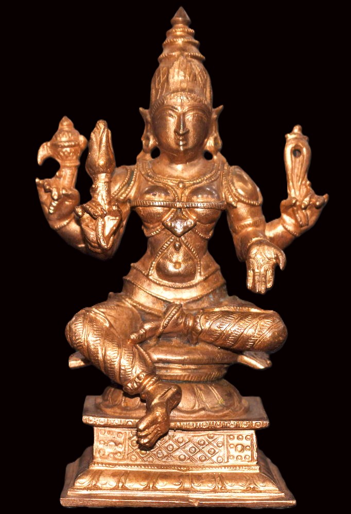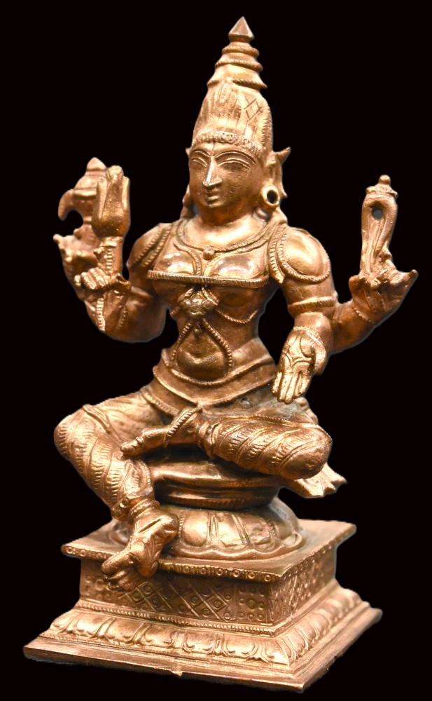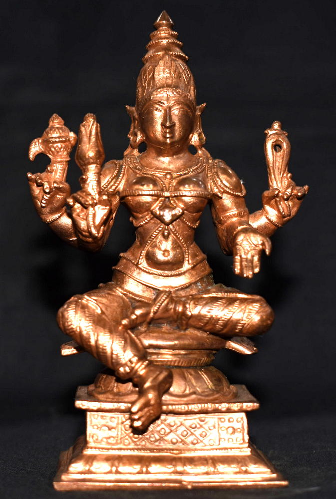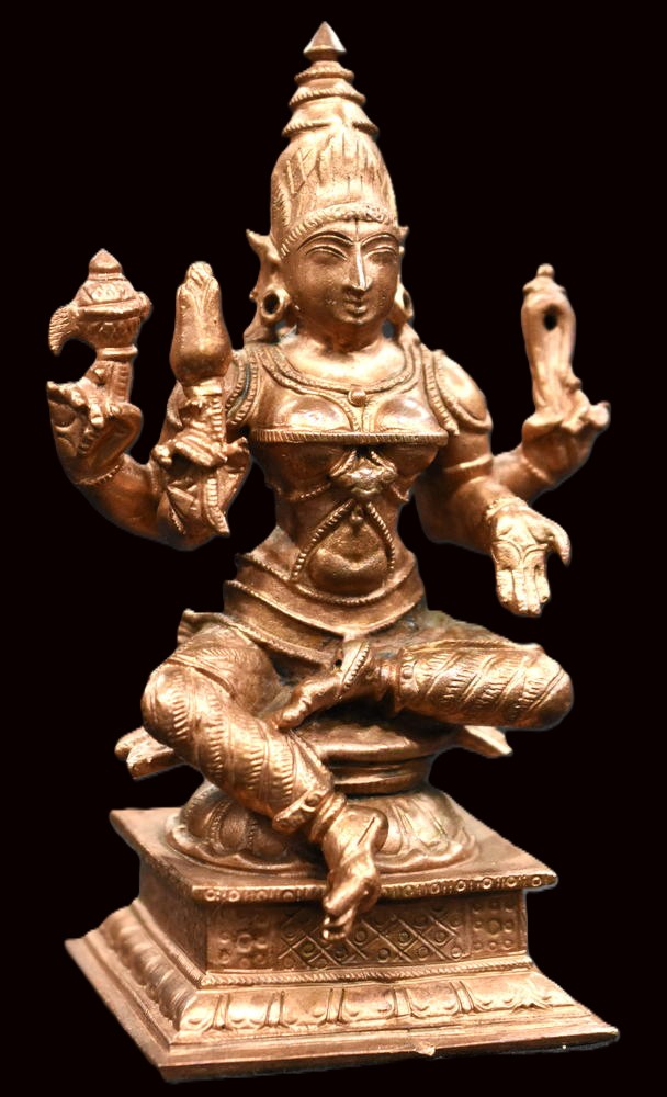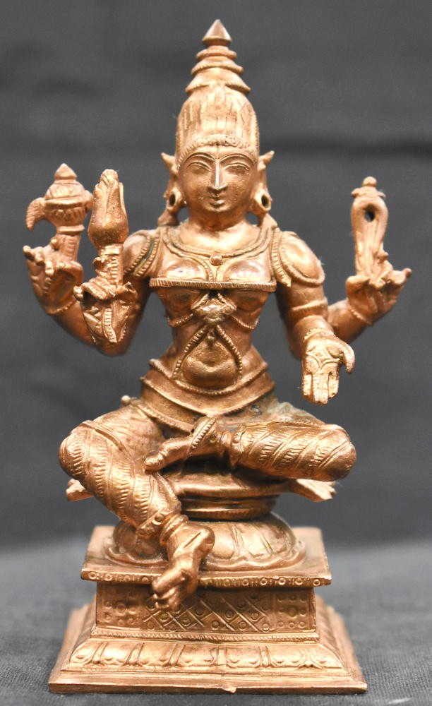 Majestic Idol of Goddess KaliKambal brilliantly crafted in heavy Copper looks exceptionally mesmerizing and divine. Truly an example of brilliant craftsmanship, the Idol features Goddess gracefully seated on Pedestal, Goddess adorning a medieval crown and ornaments . She is carrying a Shankha , lotus , noose and other hand showing in varada mudra crafted in traditional South India style.