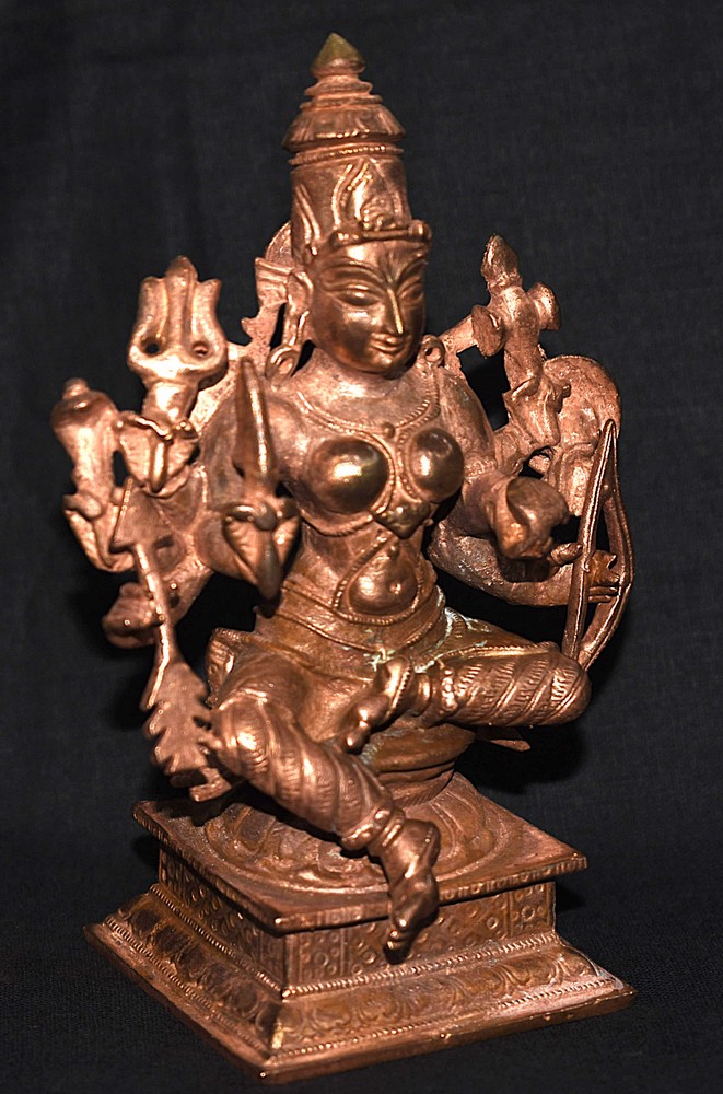 Majestic Idol of Goddess Shakti – Durga brilliantly crafted in heavy Copper looks exceptionally mesmerizing and divine. Truly an example of brilliant craftsmanship, the Idol features Goddess gracefully seated on Lotus, Goddess adorning a medieval crown and ornaments . She have a Eight hands holding bow , arrow , sword , sheild , trident , axe , noose , khappar (bowl) , crafted in traditional South India style.