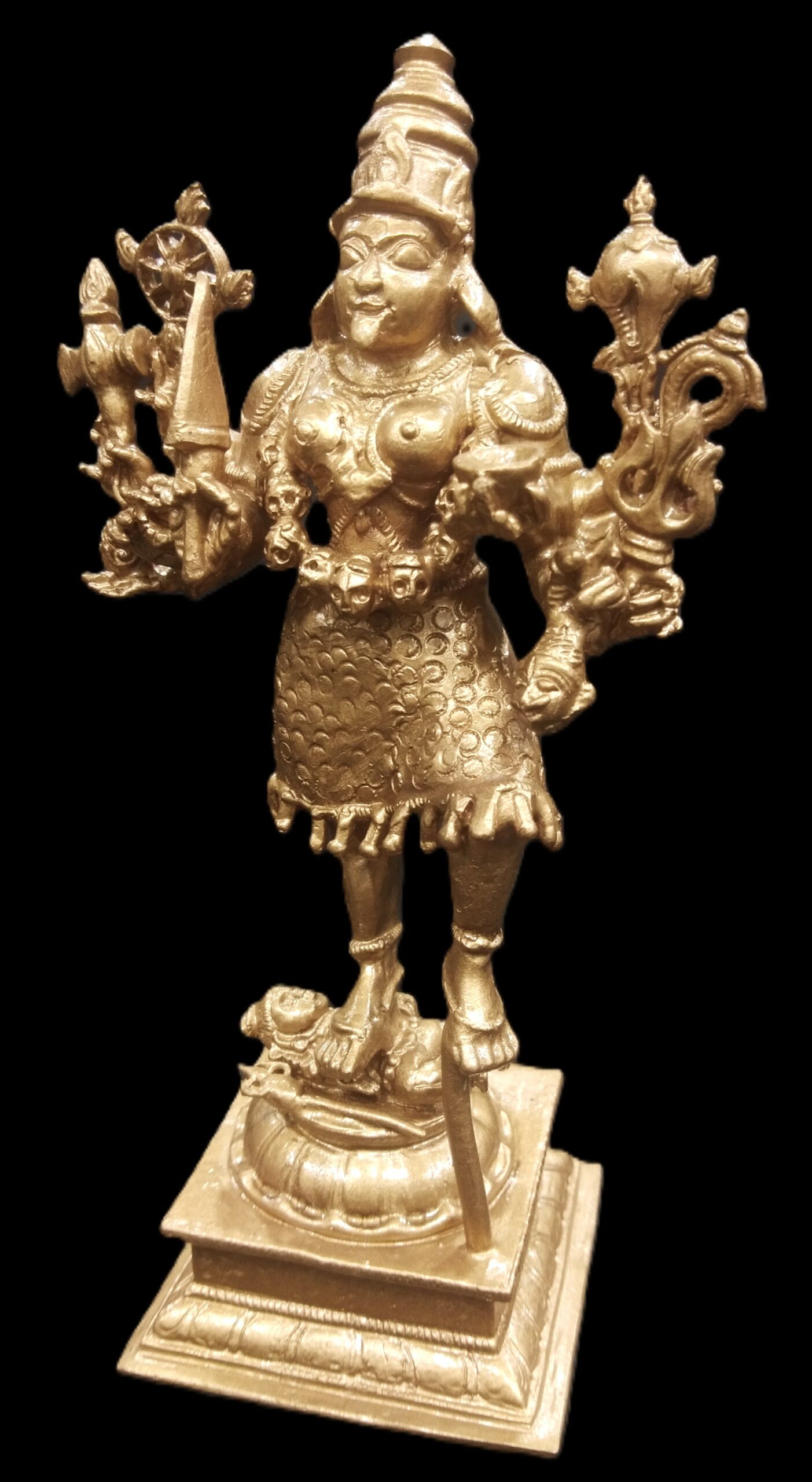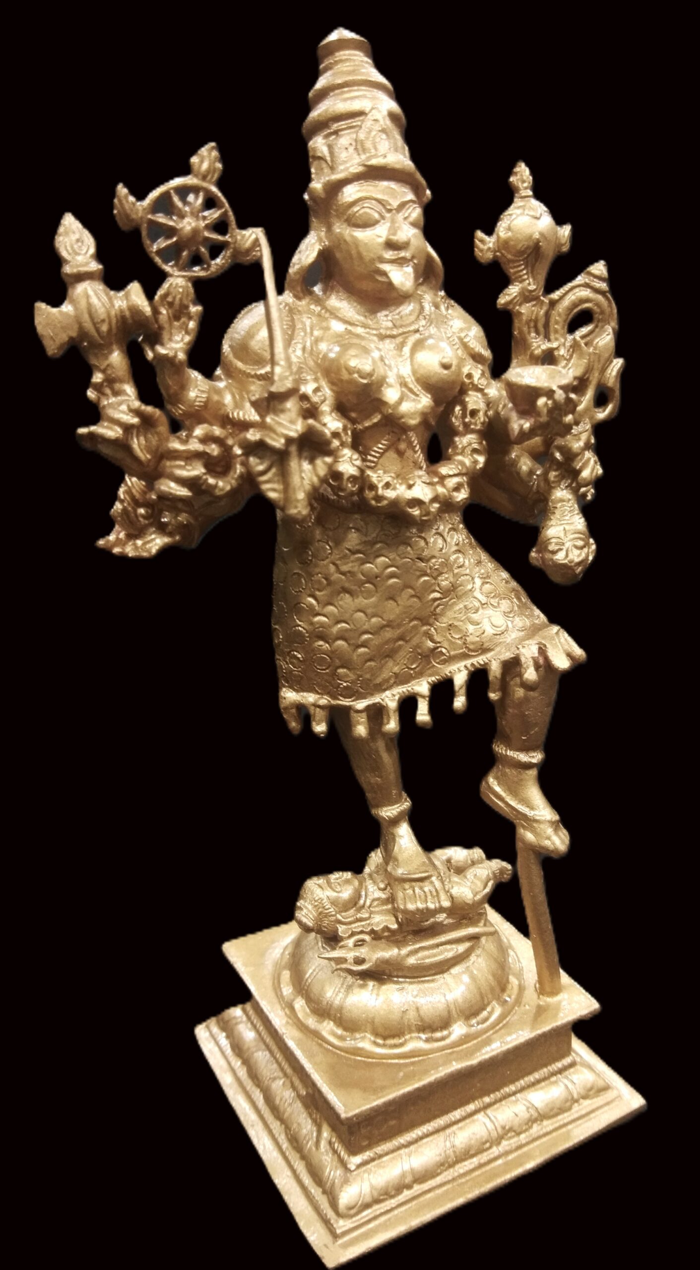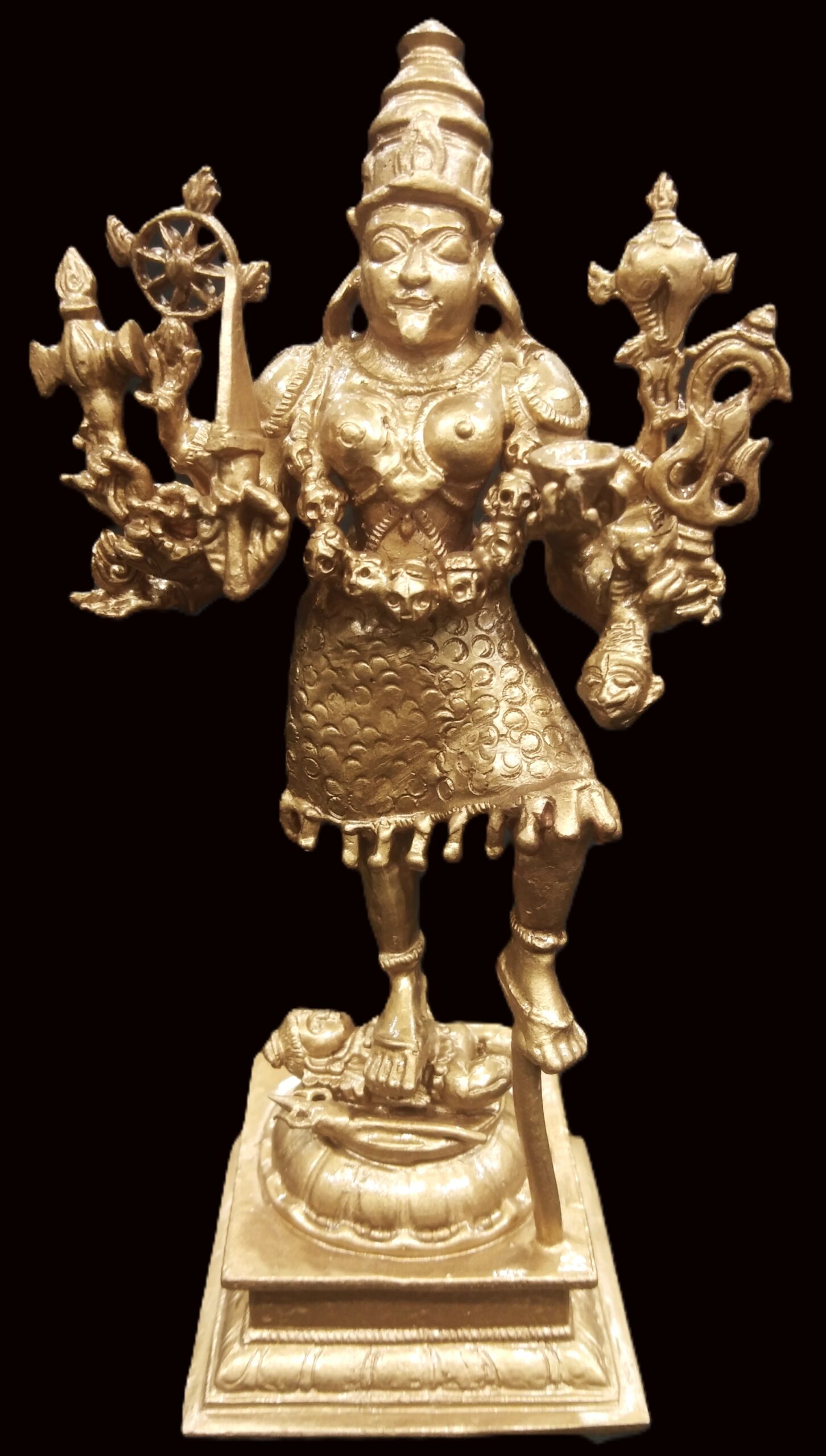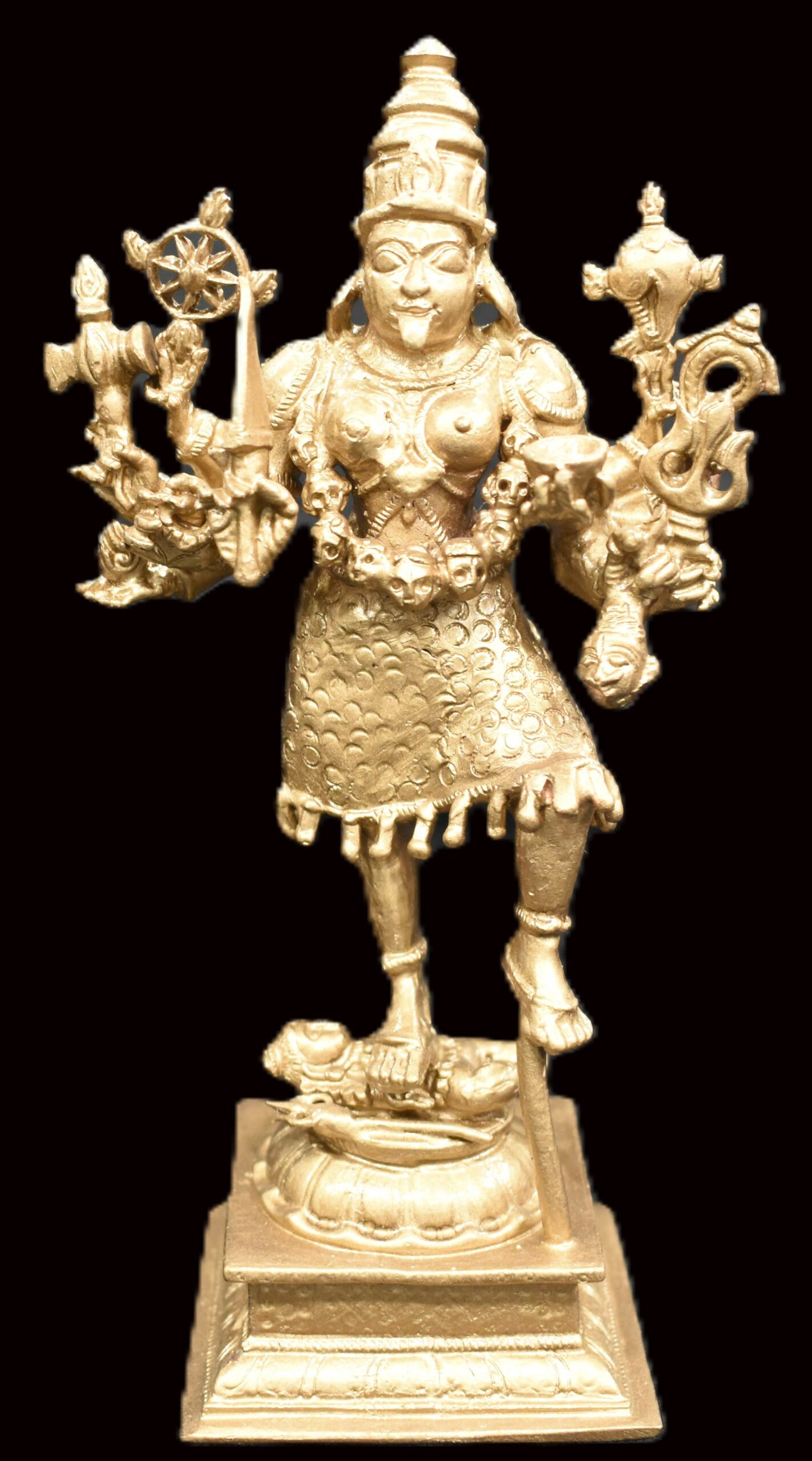 Idol featuring Goddess Kali with Lord Shiva placed on traditional designed dais is artistically crafted in solid copper by skilled artisans of South India. In this idol, Lord Shiva is seen beneath Her and Goddess Kali is seen adorning a crown and wearing a garland of skulls . She is wearing jewels, garland of skulls and also holding Kapala (human head) representing ego and attachment. In this idol Goddess mahakali having 8 hands holding sword , Axe ,chakra , bowl (khappar) , Kapala (human head) , Trident (trishul) , Shankha (conch) , rosary , representing Her blessings of wisdom and insight that helps liberate one of human bondage and ego. Goddess Kali is one of the aspects of Divine mother, Who compassionately destroys Her devotees ego. Shiva under Her feet represents passive and submissive male energy and Goddess represents active and dominant female energy. The union of both energy leads to creation. You may install this divine Idol in your living room, work space, near entrance or in altar.