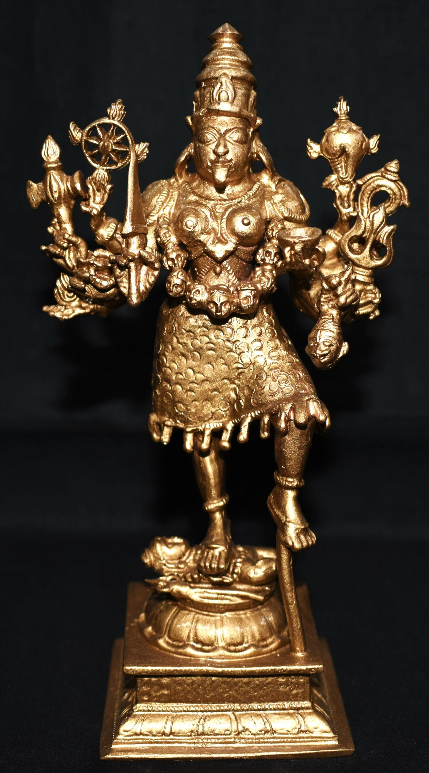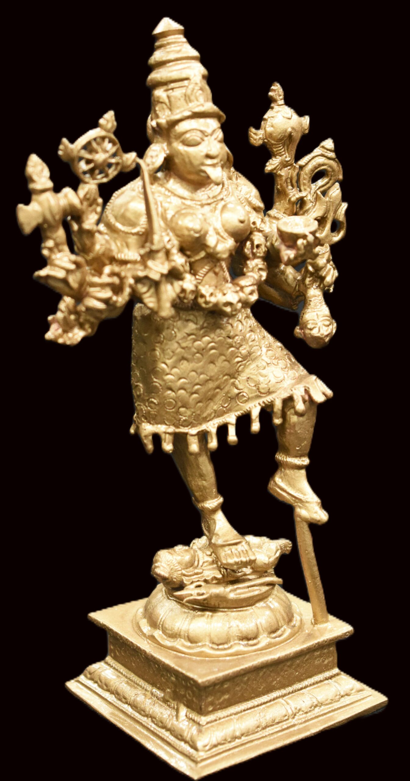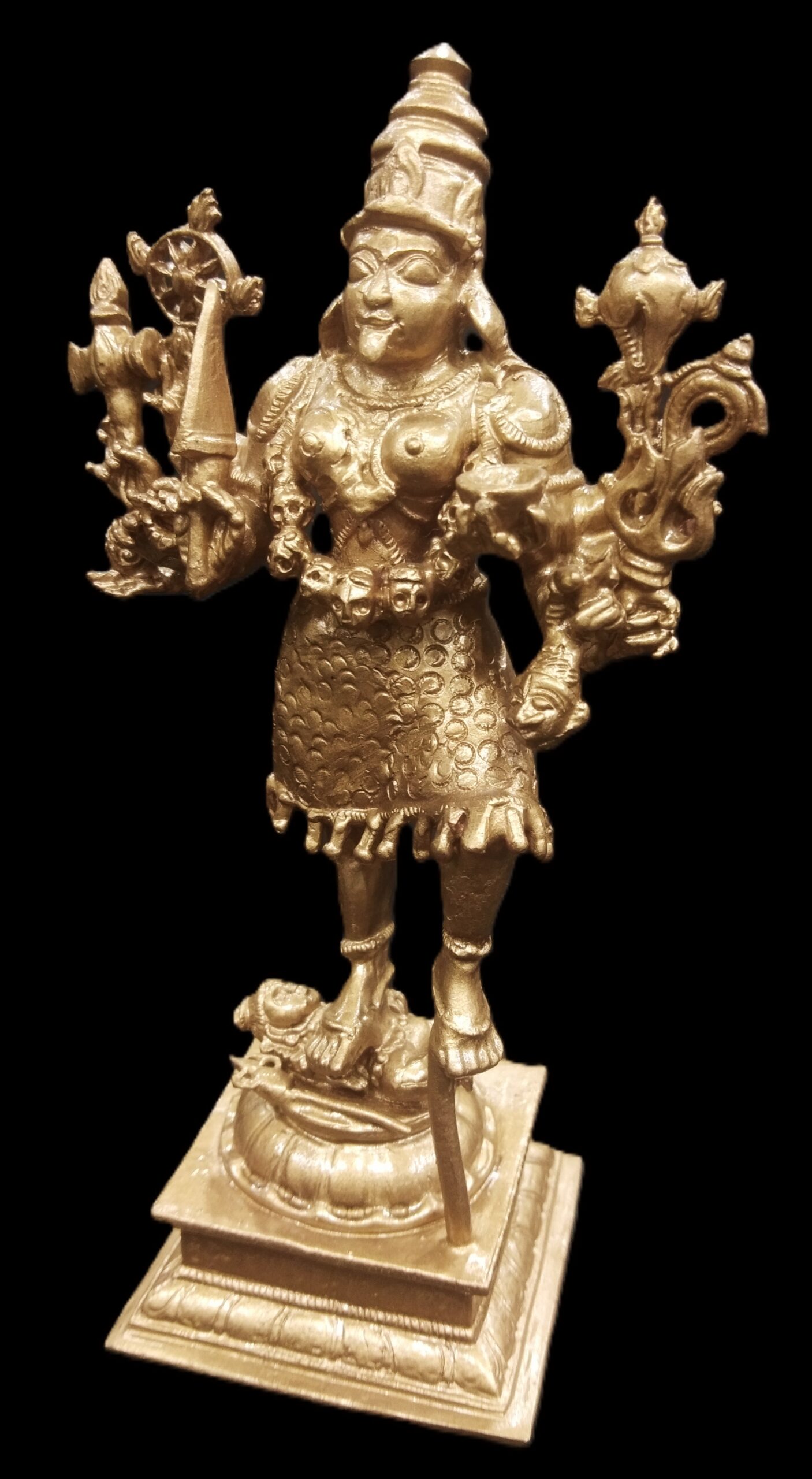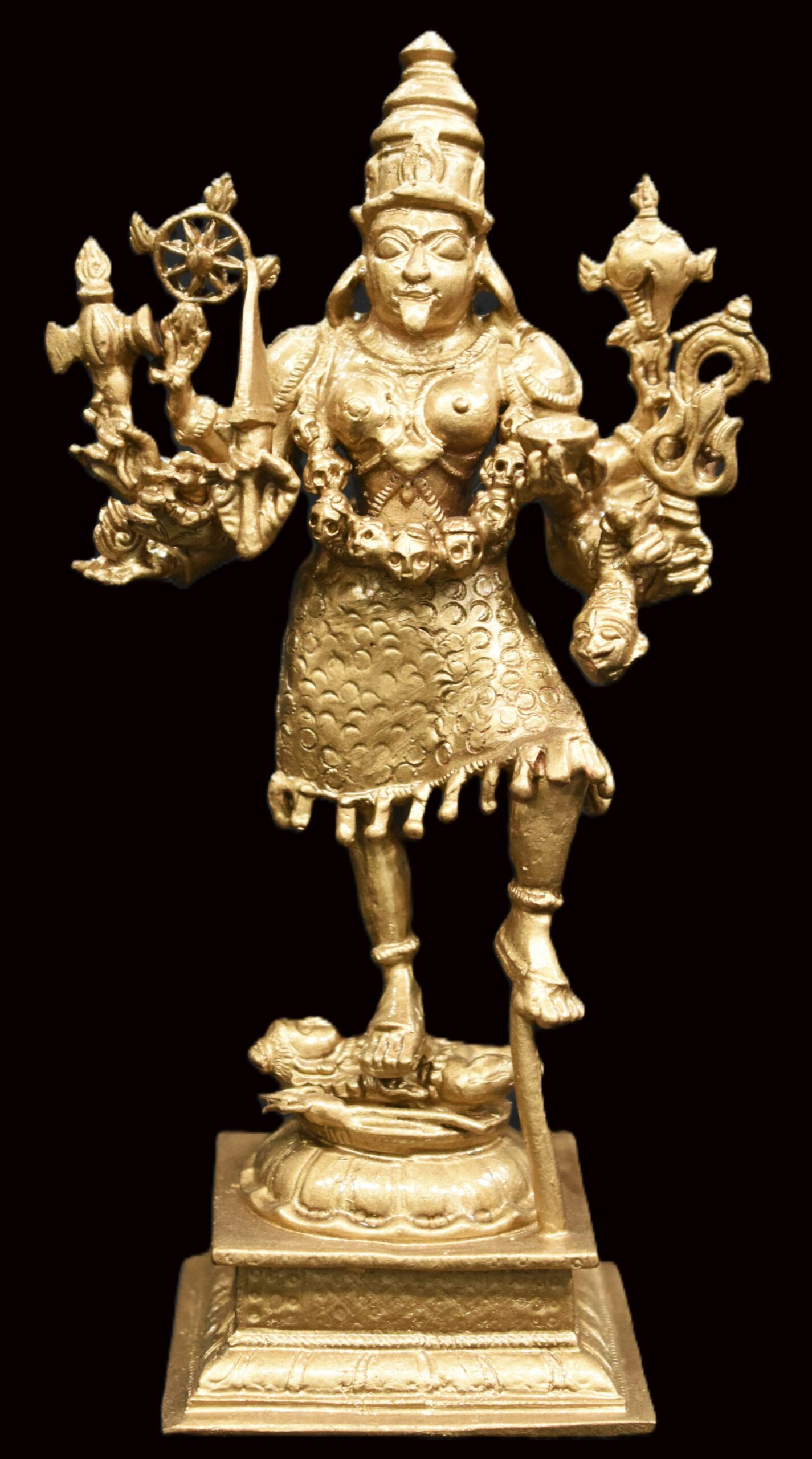 Idol featuring Goddess Kali with Lord Shiva placed on traditional designed dais is artistically crafted in solid copper by skilled artisans of South India. In this idol, Lord Shiva is seen beneath Her and Goddess Kali is seen adorning a crown and wearing a garland of skulls . She is wearing jewels, garland of skulls and also holding Kapala (human head) representing ego and attachment. In this idol Goddess mahakali having 8 hands holding sword , Axe ,chakra , bowl (khappar) , Kapala (human head) , Trident (trishul) , Shankha (conch) , rosary , representing Her blessings of wisdom and insight that helps liberate one of human bondage and ego. Goddess Kali is one of the aspects of Divine mother, Who compassionately destroys Her devotees ego. Shiva under Her feet represents passive and submissive male energy and Goddess represents active and dominant female energy. The union of both energy leads to creation. You may install this divine Idol in your living room, work space, near entrance or in altar.