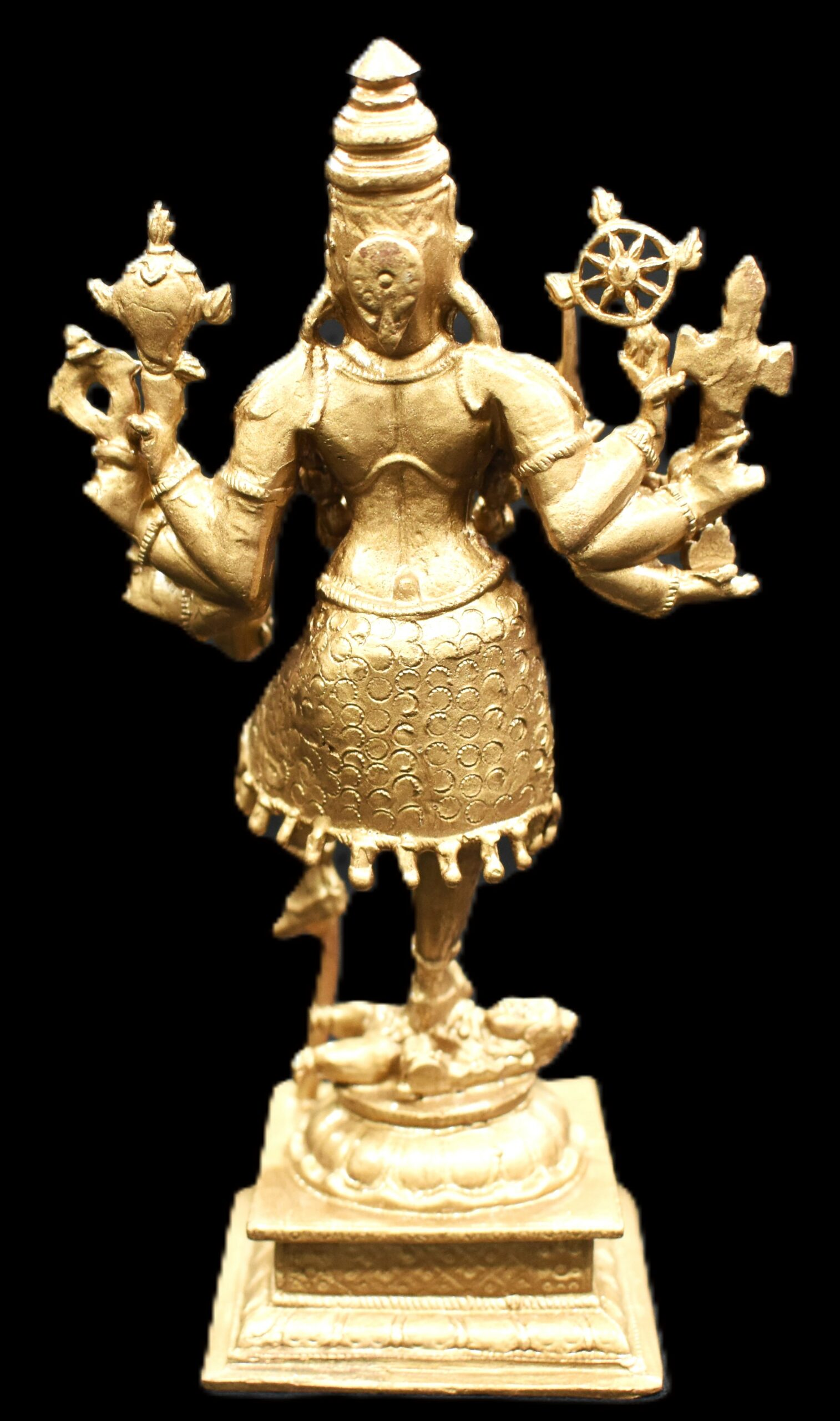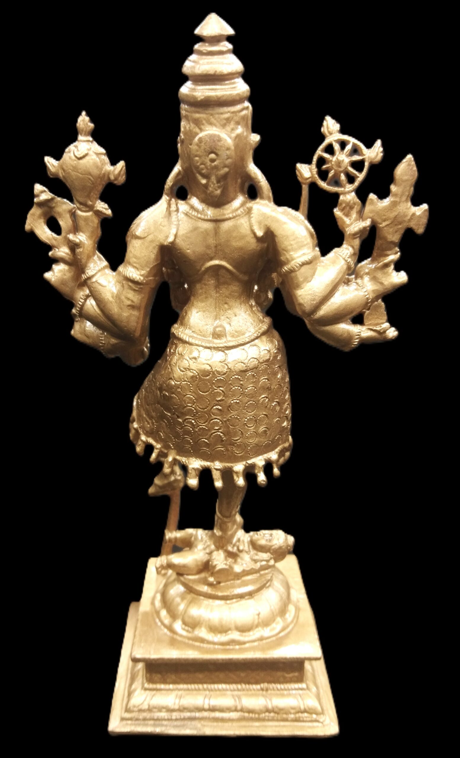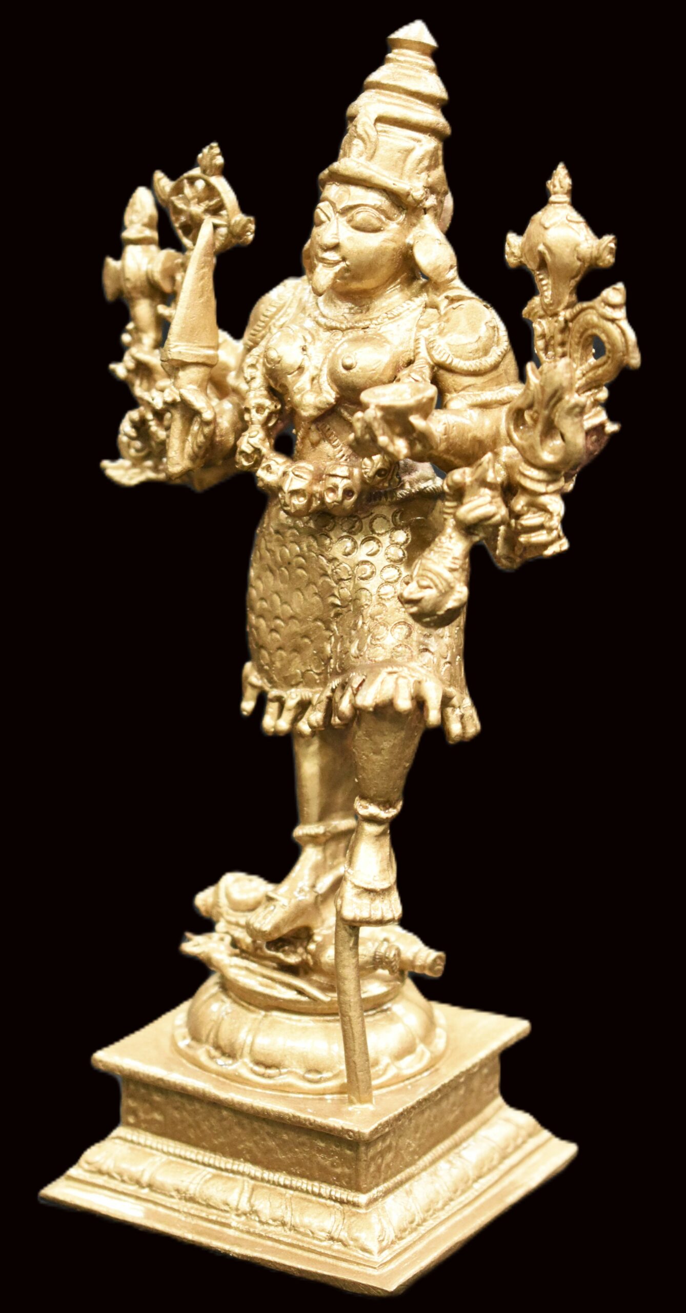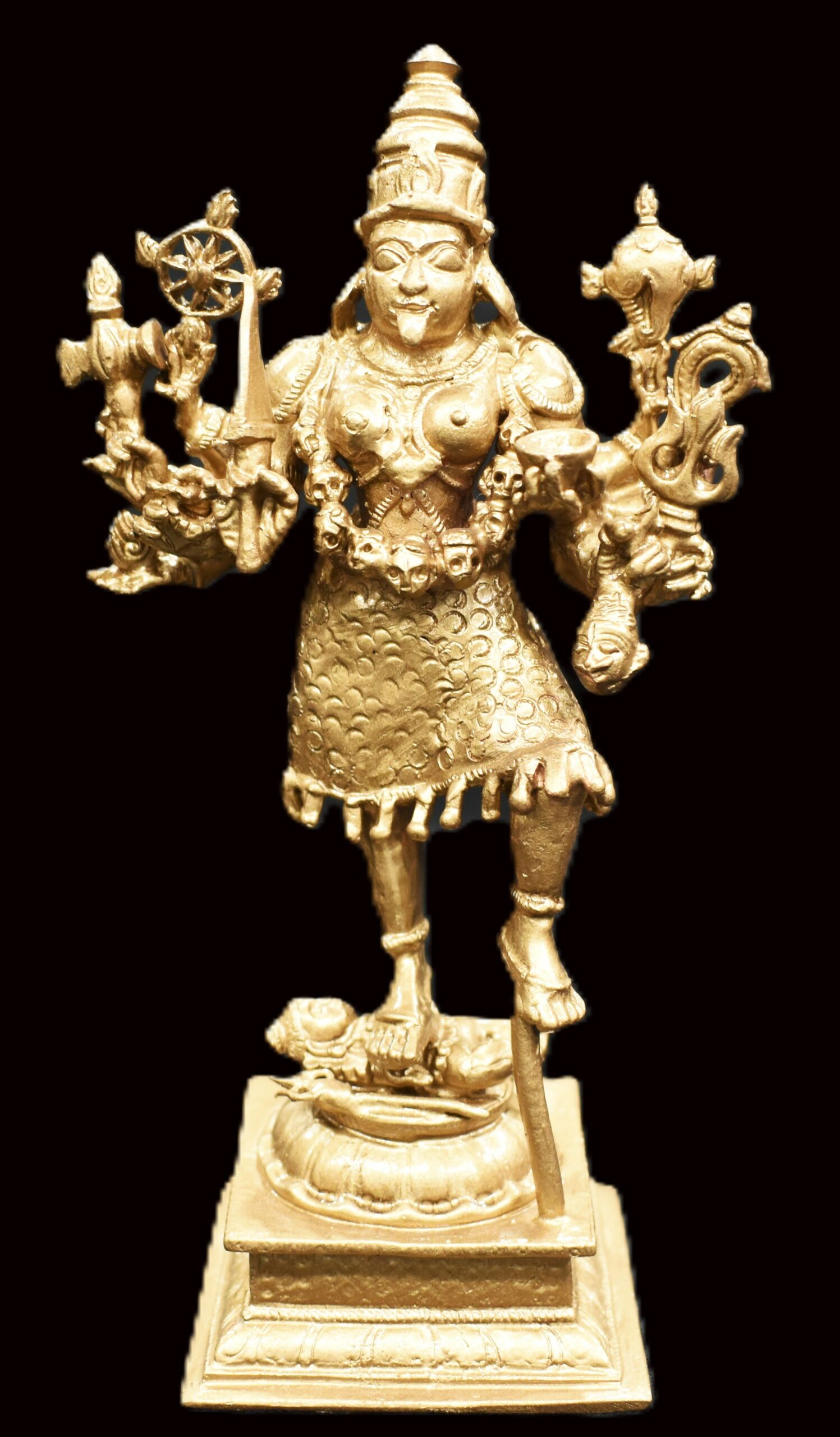 Idol featuring Goddess Kali with Lord Shiva placed on traditional designed dais is artistically crafted in solid copper by skilled artisans of South India. In this idol, Lord Shiva is seen beneath Her and Goddess Kali is seen adorning a crown and wearing a garland of skulls . She is wearing jewels, garland of skulls and also holding Kapala (human head) representing ego and attachment. In this idol Goddess mahakali having 8 hands holding sword , Axe ,chakra , bowl (khappar) , Kapala (human head) , Trident (trishul) , Shankha (conch) , rosary , representing Her blessings of wisdom and insight that helps liberate one of human bondage and ego. Goddess Kali is one of the aspects of Divine mother, Who compassionately destroys Her devotees ego. Shiva under Her feet represents passive and submissive male energy and Goddess represents active and dominant female energy. The union of both energy leads to creation. You may install this divine Idol in your living room, work space, near entrance or in altar.