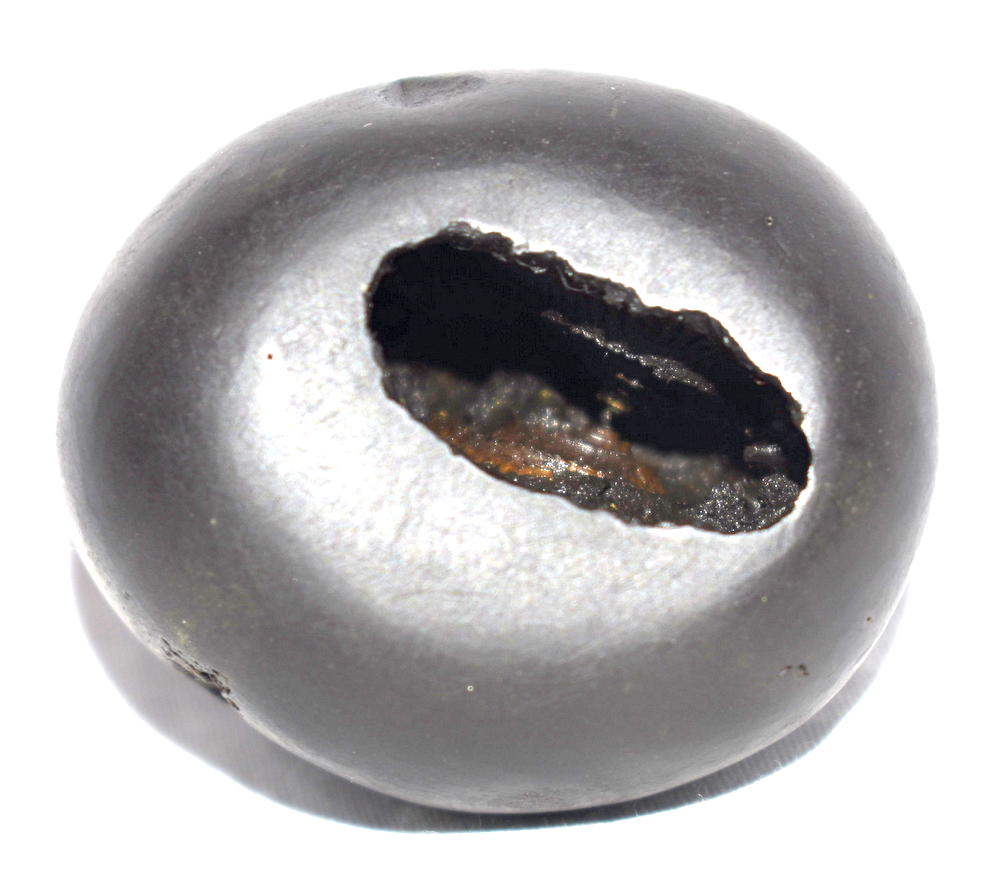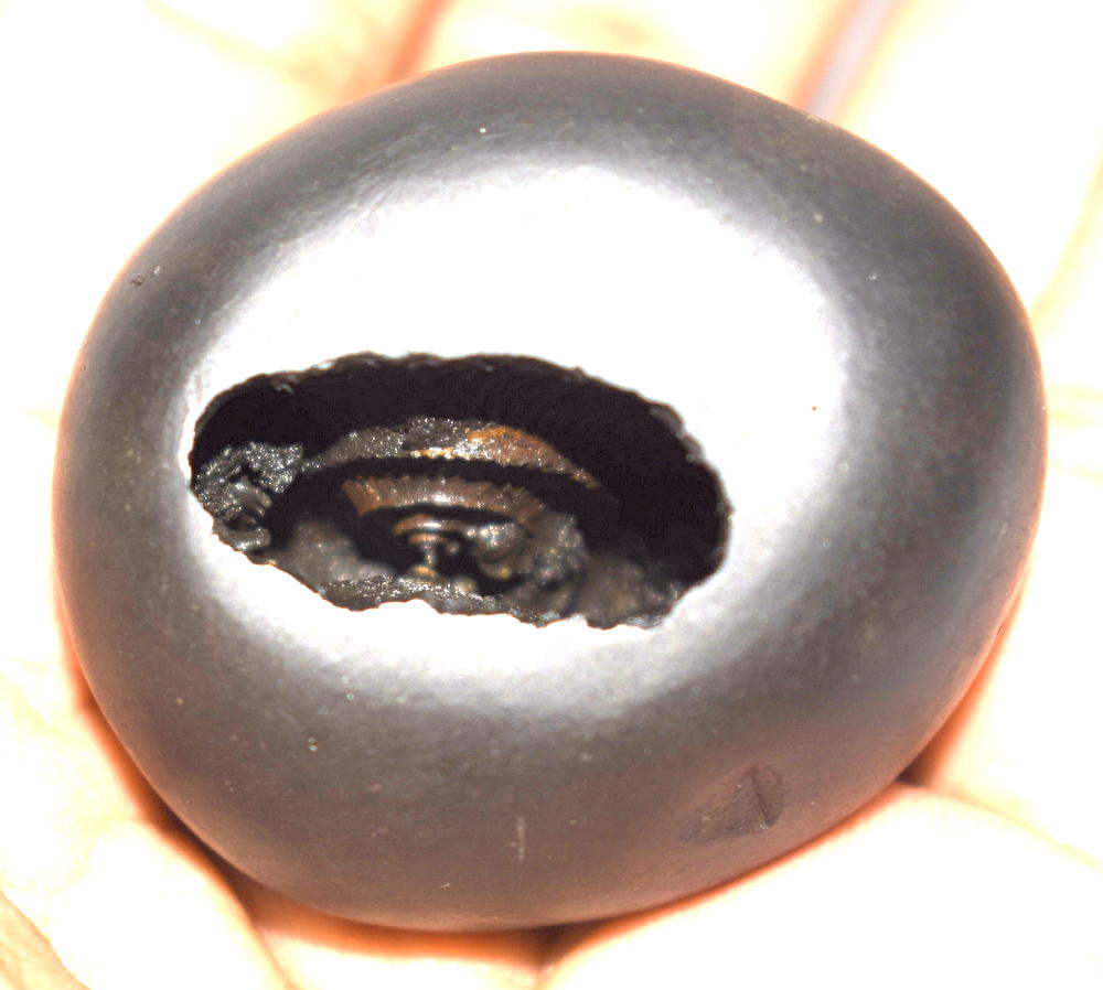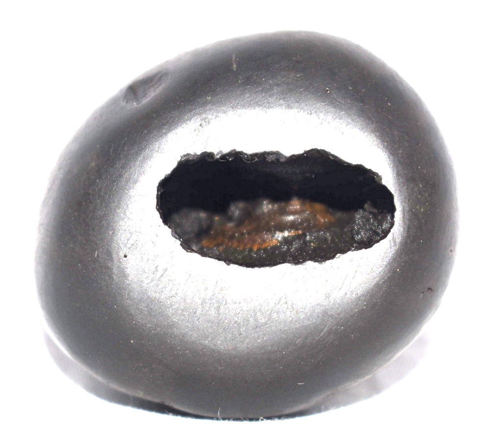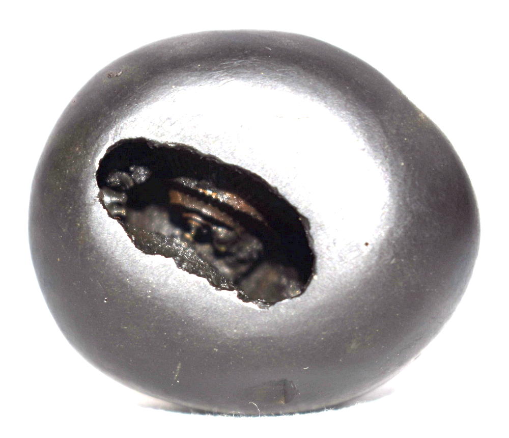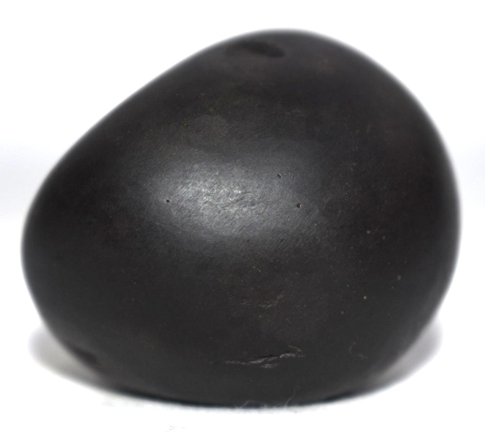 Round Black color Smooth body , 1 opening : 2 chakras on left side , reddish color on chakra , with reddish color tinge on body , Mark of Sacrificial Sticks (Sruk and Sruva) on side .