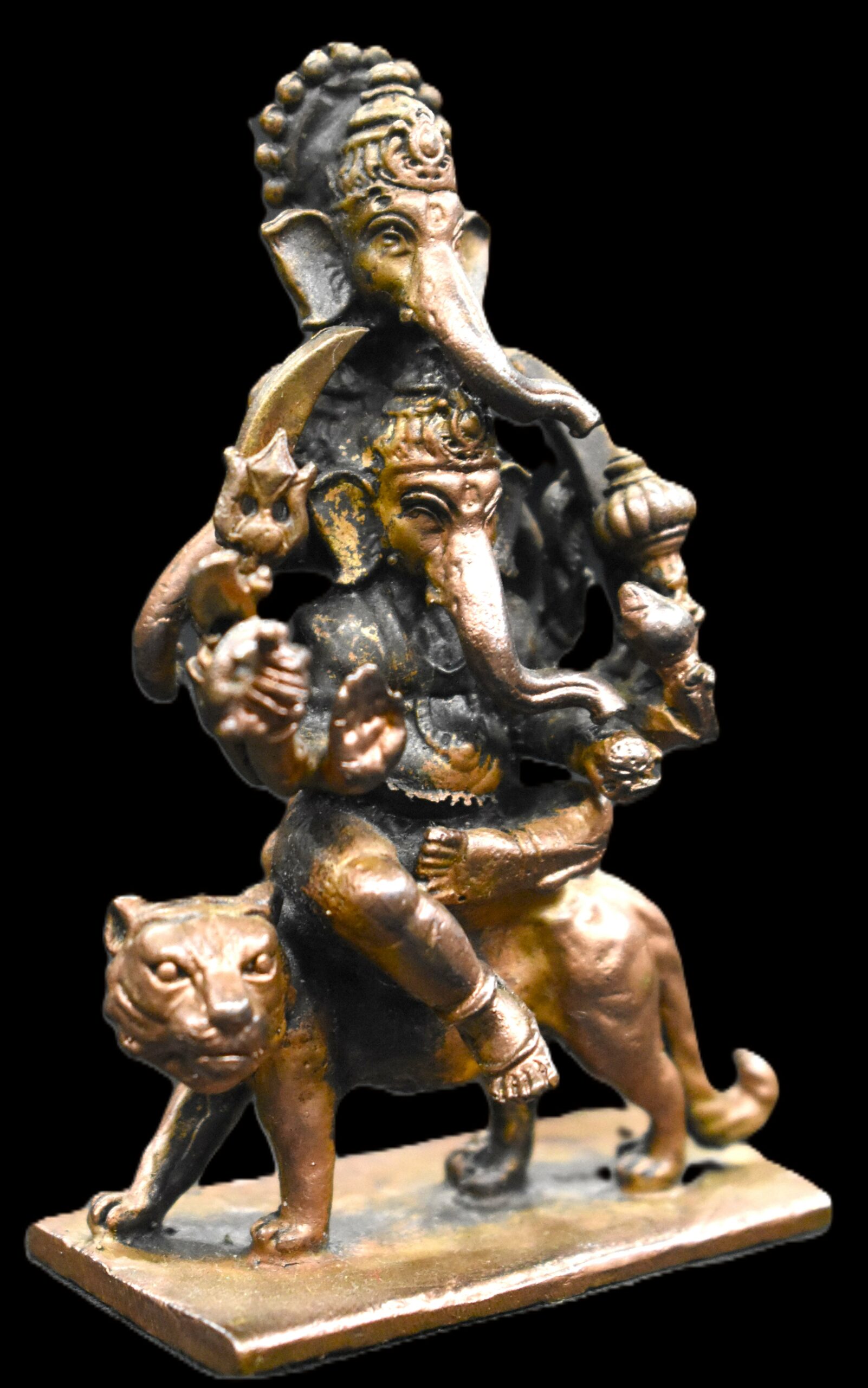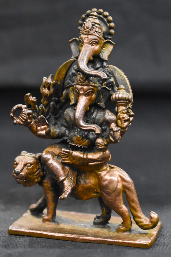 Design : Divine Majestic idol of Dwija Ganesha seated on lion, is gorgeously crafted in heavy Copper by artisans of south India . Lord Ganapati idol with four faces, each symbolizing peace (sukh) prosperity (samriddhi) , health(arogya) and Long life (aayu) , seated on lion. Ganesha having 10 hands holding sword , trident , mace , elephant goad (ankusha) , rosary , lotus and modak .