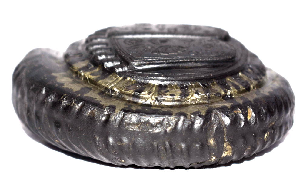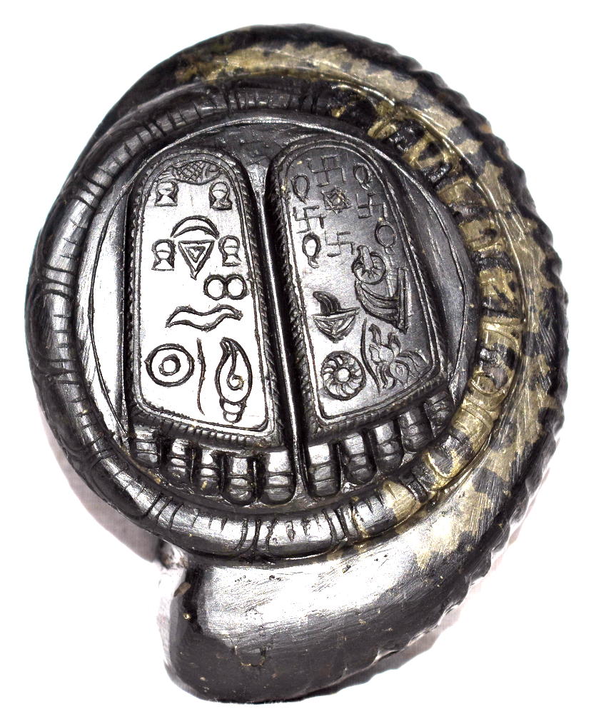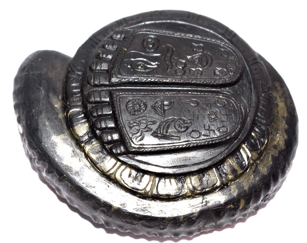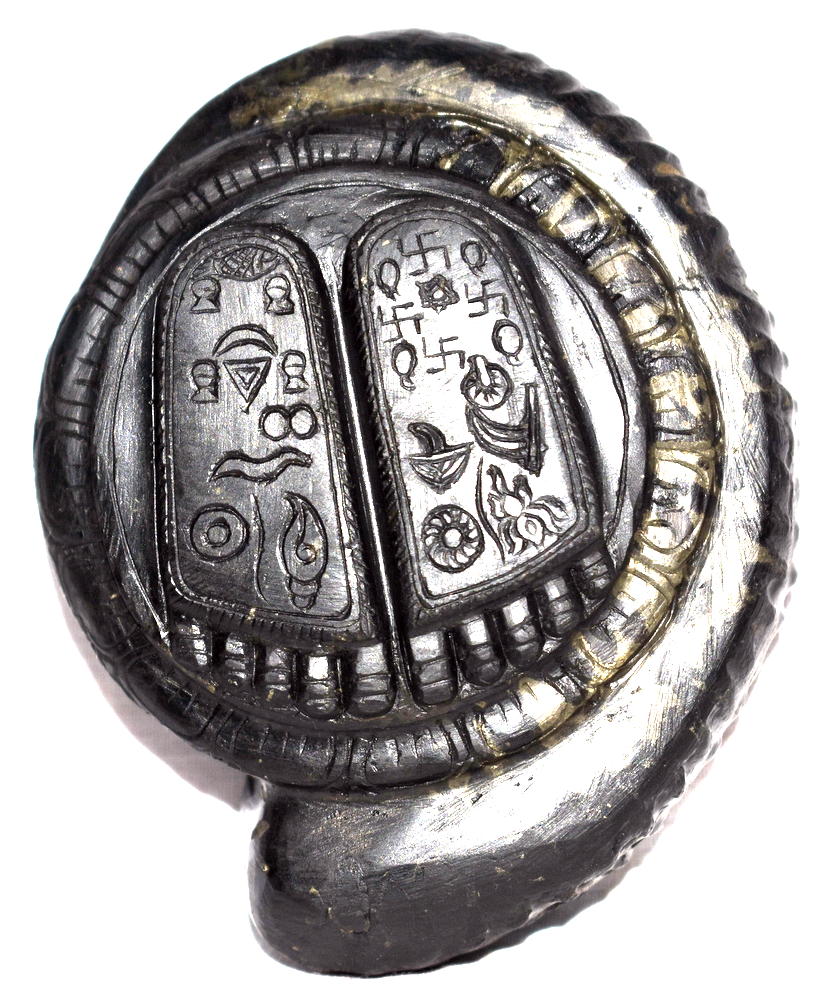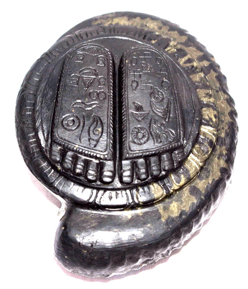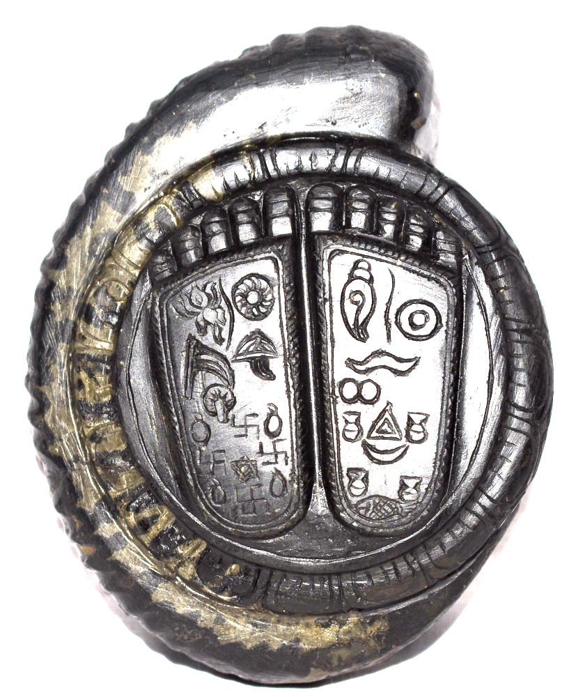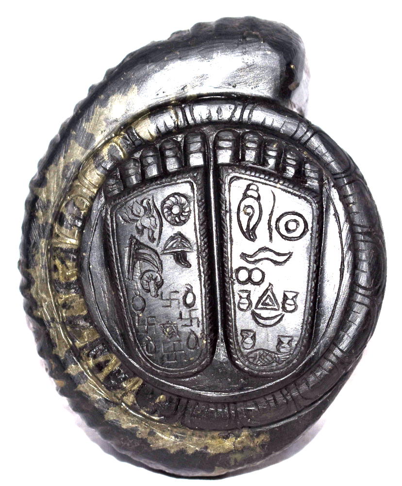 Lord Krishna Charan Paduka Symbolizes the Foot Prints of Lord Krishna , with all the auspicious symbols carved in Natural Golden Shankha Shape Keshava Shaligram of Gandaki River Nepal.