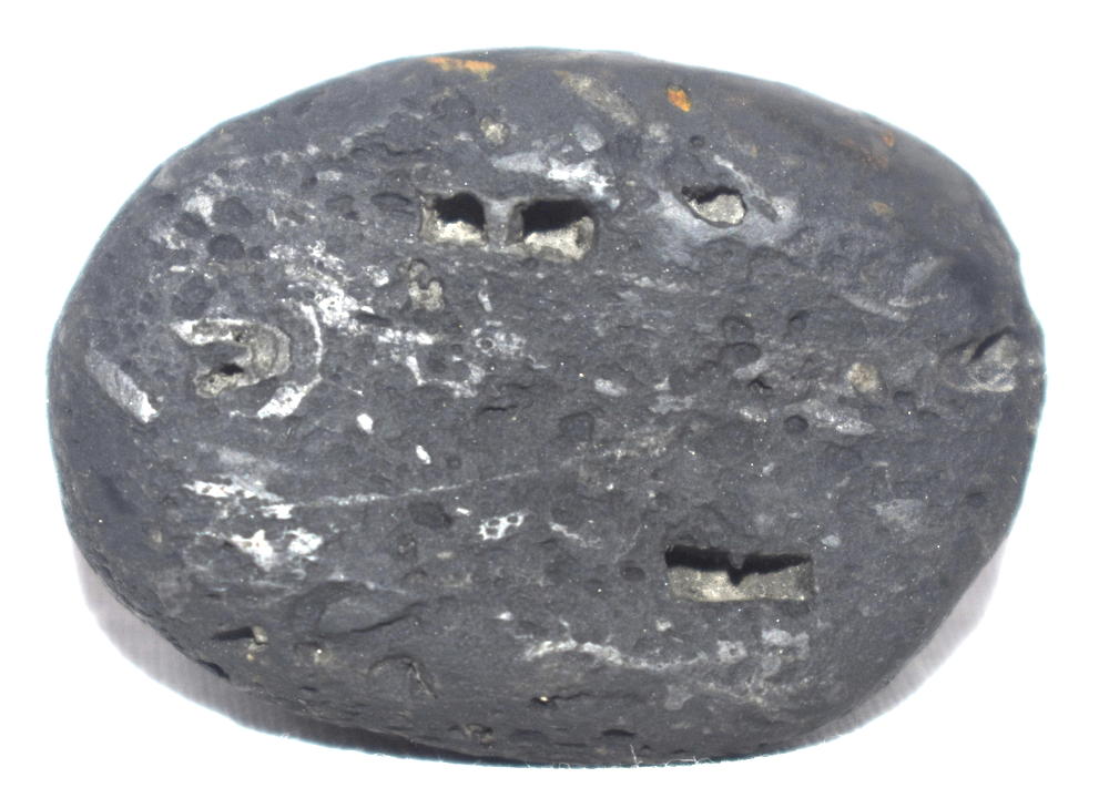 Shaligram having bow;egg shaped; blue-black; eleavated back;arrow, bow and quiver; kalpavruksha sign; equal minute chakras; 5 vadana – 10 chakras; umbrella, chamara signs; side chakra; tortoise chakra in the front lotus sign; simhasana sign is known as “ Parivara Dvadasha Chakra Pattabhi Rama Shaligram”