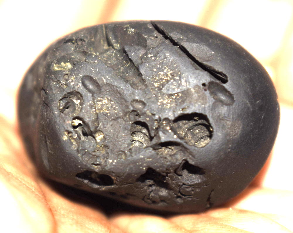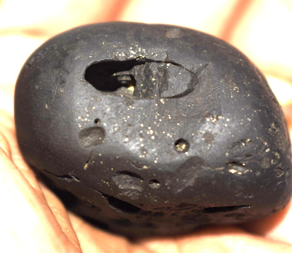 Shaligram having bow;egg shaped; blue-black; eleavated back;arrow, bow and quiver; kalpavruksha sign; equal minute chakras; 5 vadana – 10 chakras; umbrella, chamara signs; side chakra; tortoise chakra in the front lotus sign; simhasana signis known as “Parivara DvaDasha Chakra Pattabhi Rama Shaligram”
