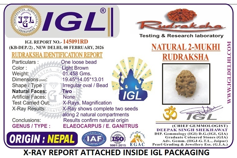 2 mukhi Rudraksha heals the Soul and connect the wearer to his soul destiny. Bestows self confidence, emotional stability, inner bliss and enhances relationships.