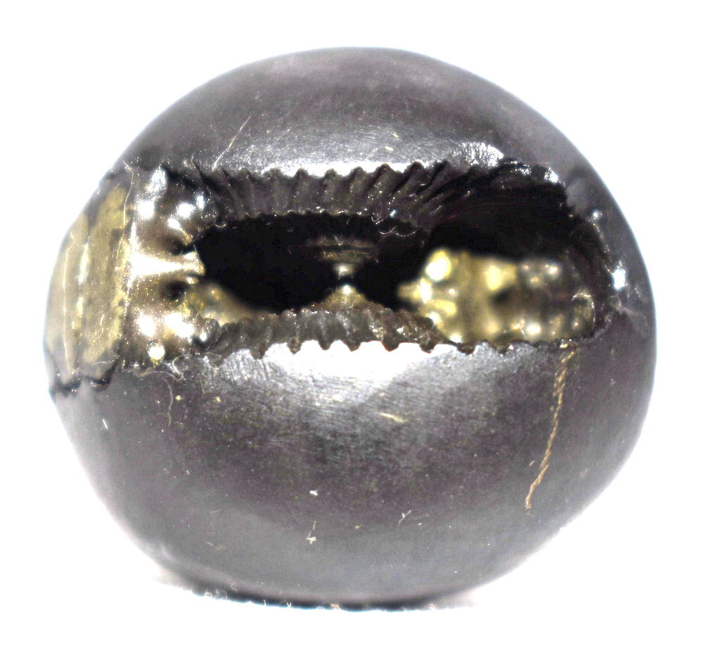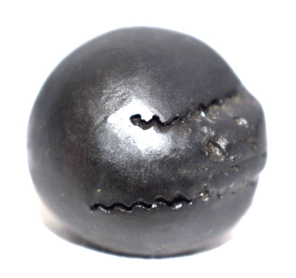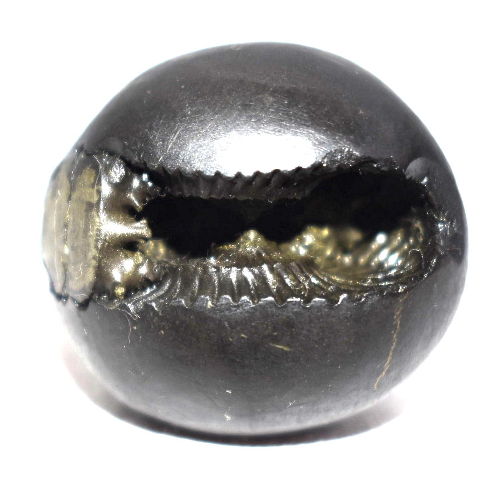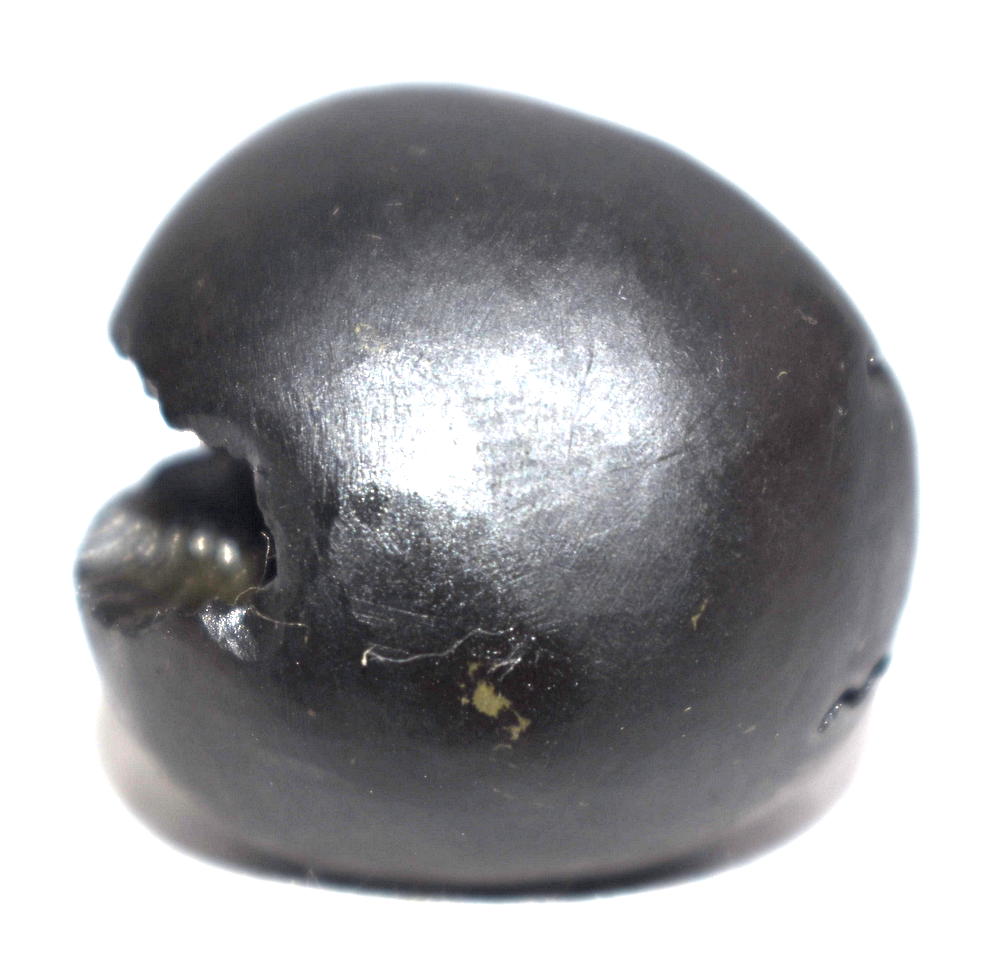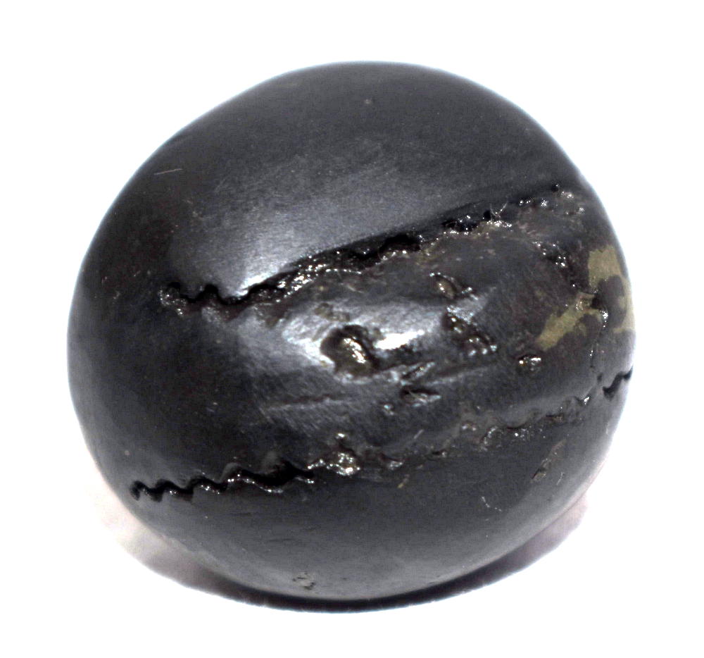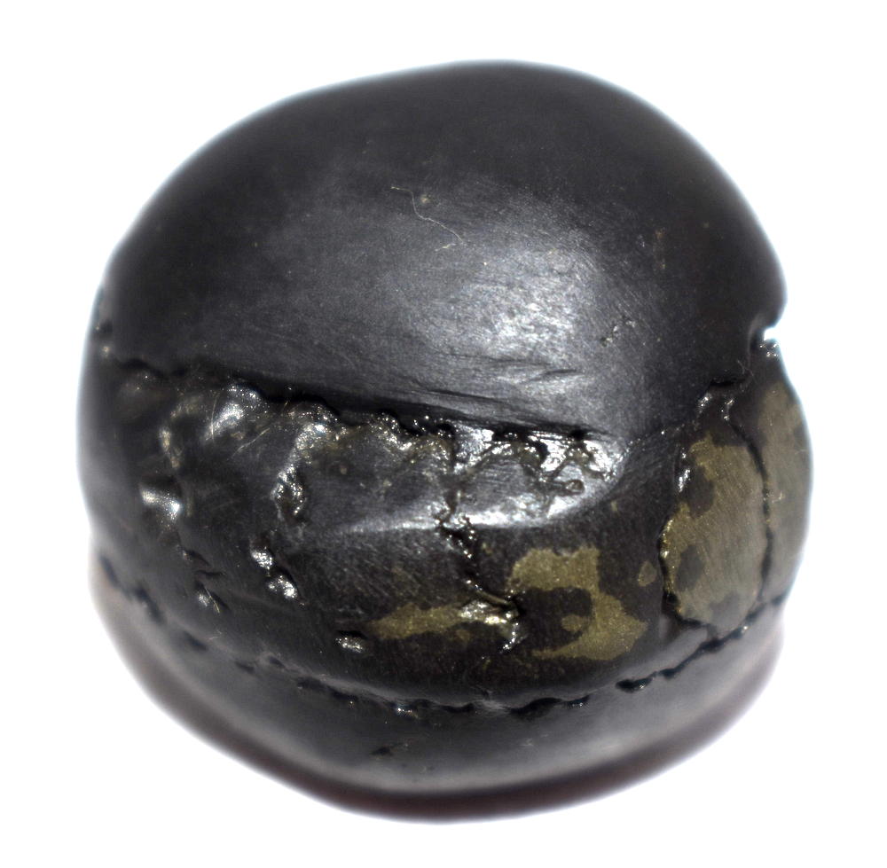 Round shape , Small Size ,Black color ,smooth and shiny body , single elongated opening with two clear chakras , golden spots on chakra , mark of golden fangs  , mark of vanamala , and snuhi pushpa sign , golden dots .