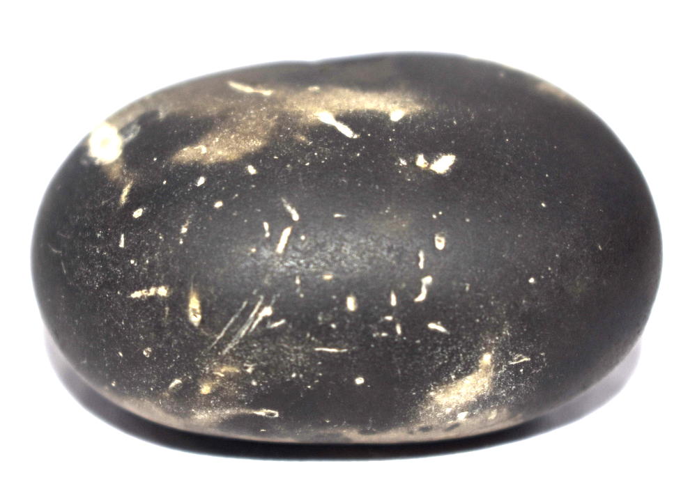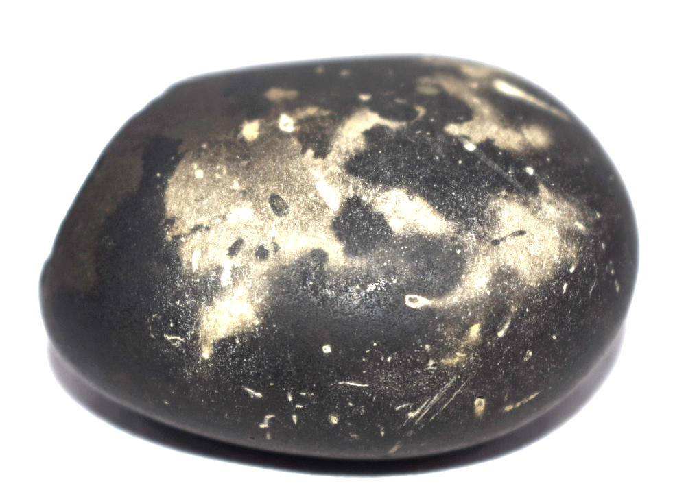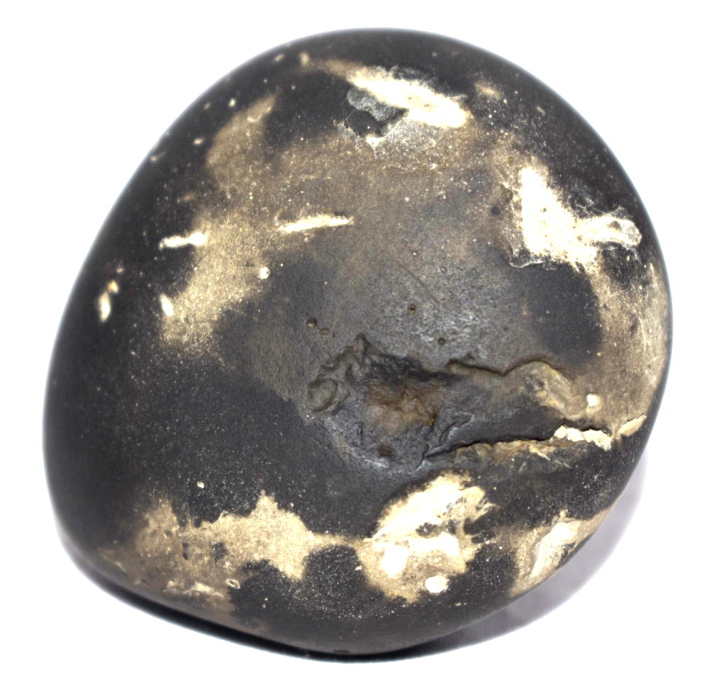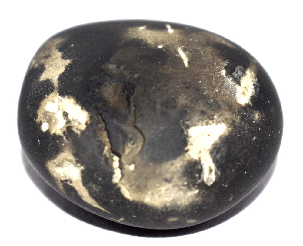 Shaligram having  left side chakra; mix of white color;   1 opening – 2 circular marks is known as ” Shuddha Vasudeva Shaligram”