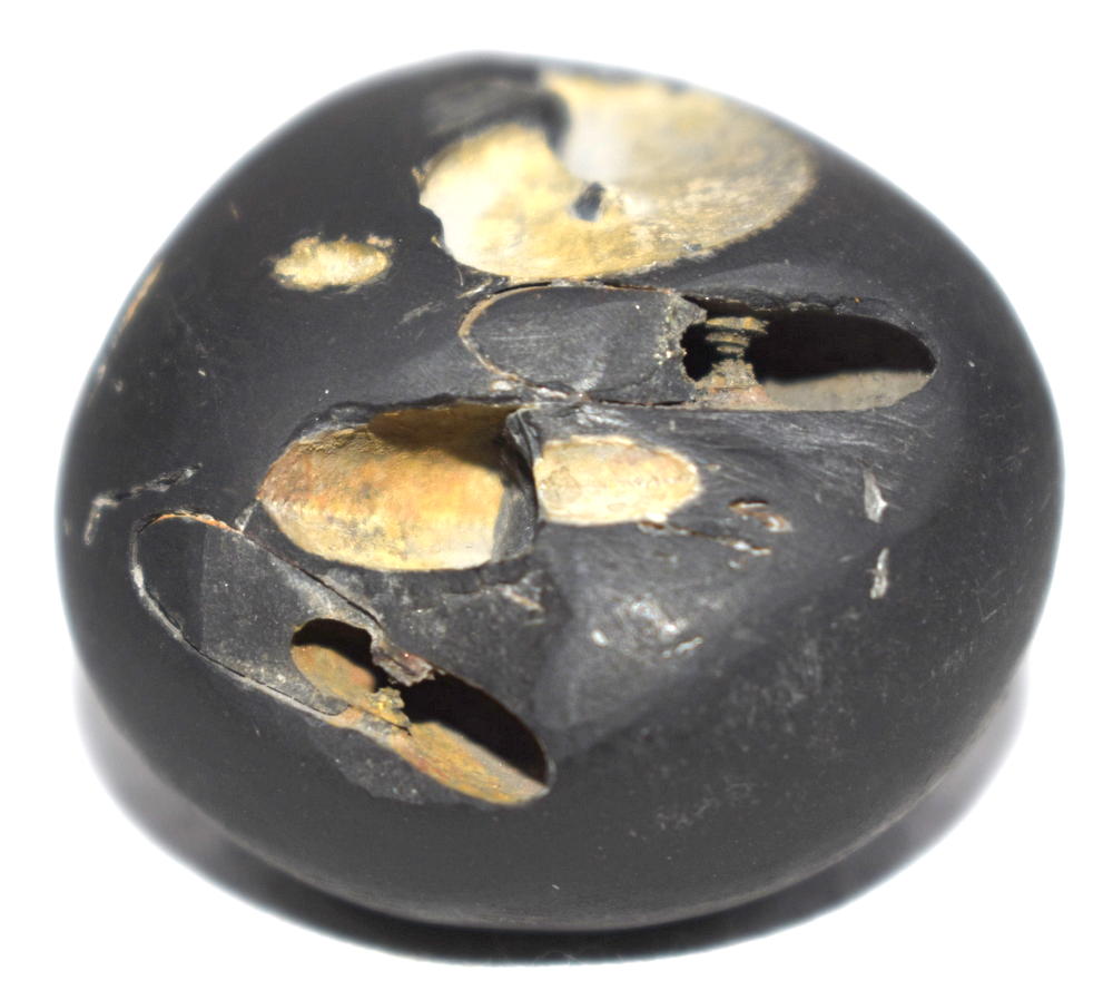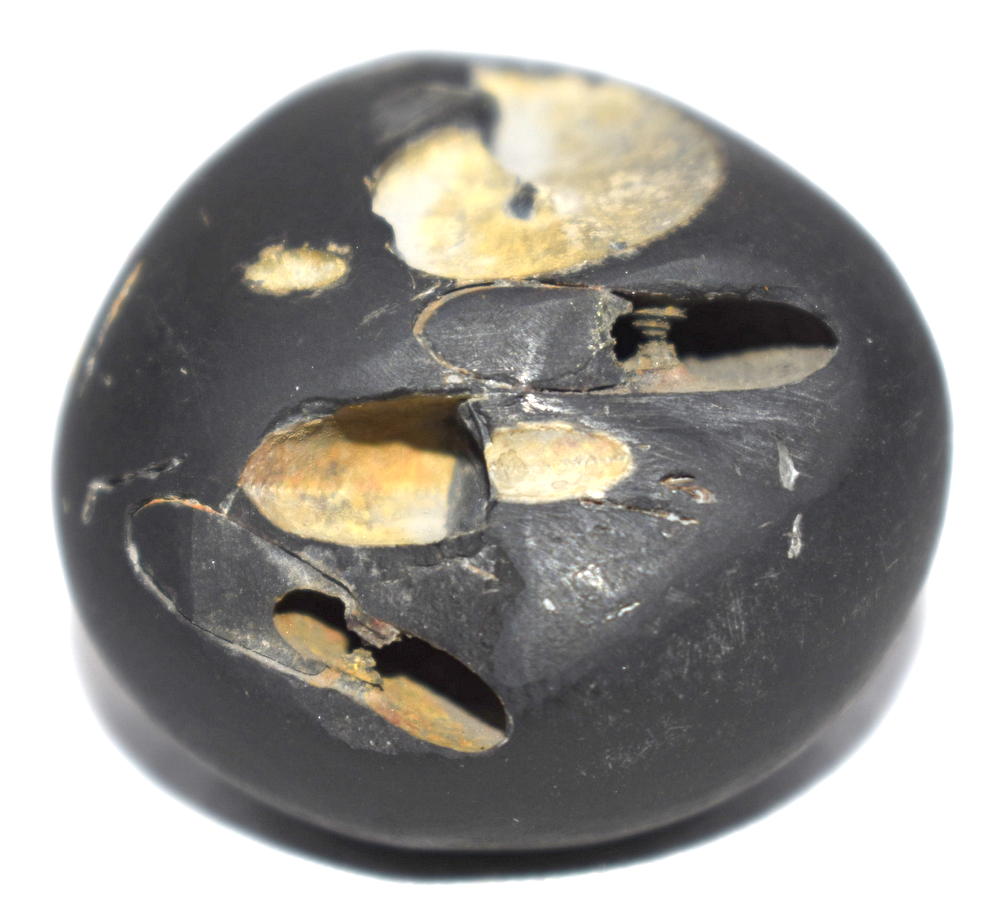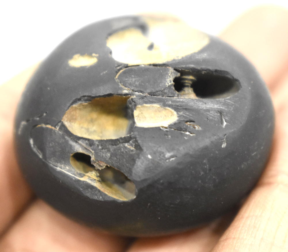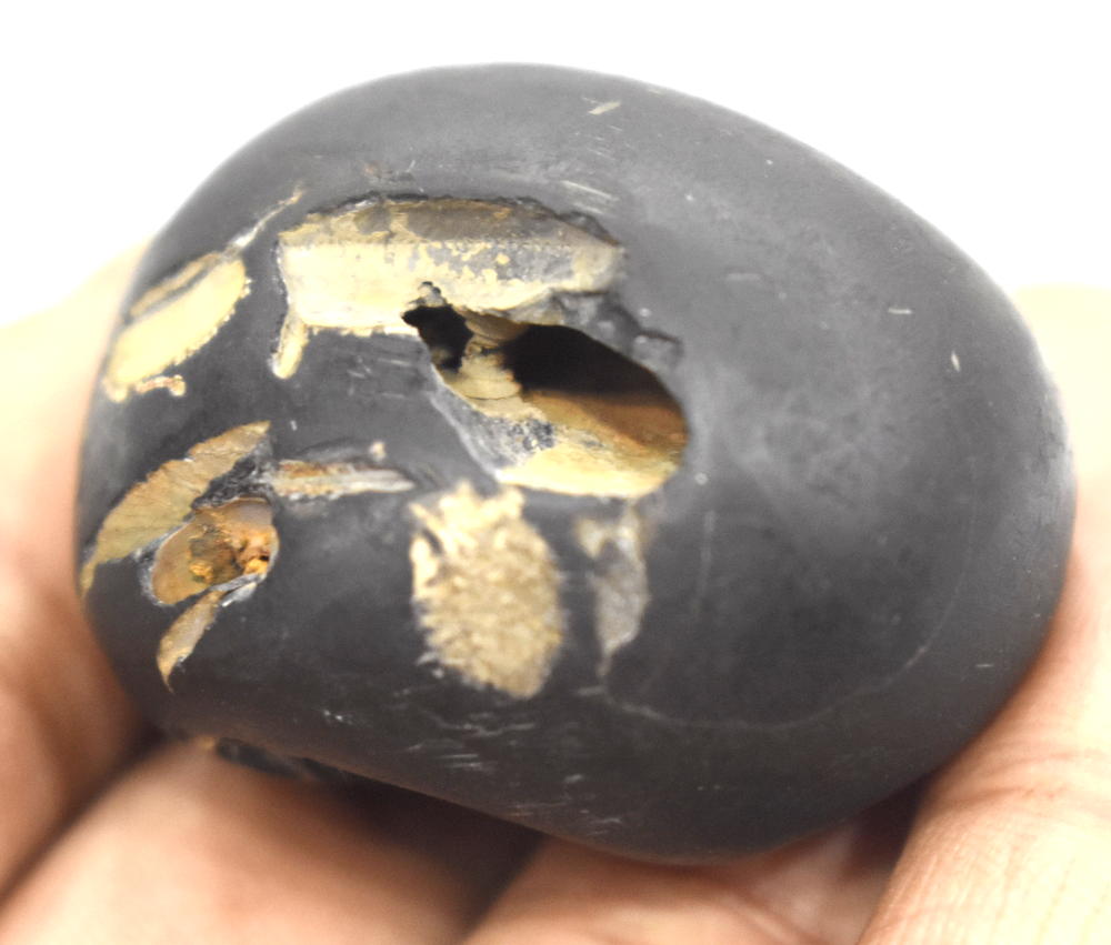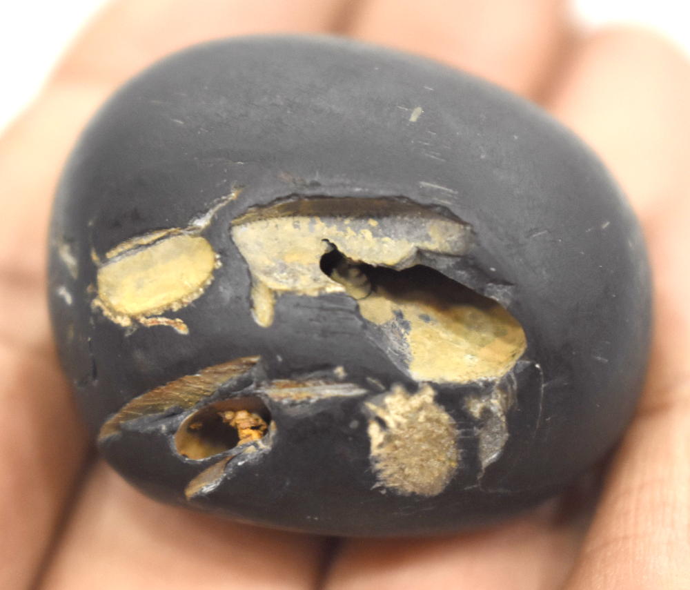Shaligram having 4 opening 8 chakras; one top side chakra; cold to touch; lines; black color; stable seat; shanka and mace, bow and arrow signs; 4 opening – 8 chakras with single chakra on top is known as Vishvaksena Shaligram .