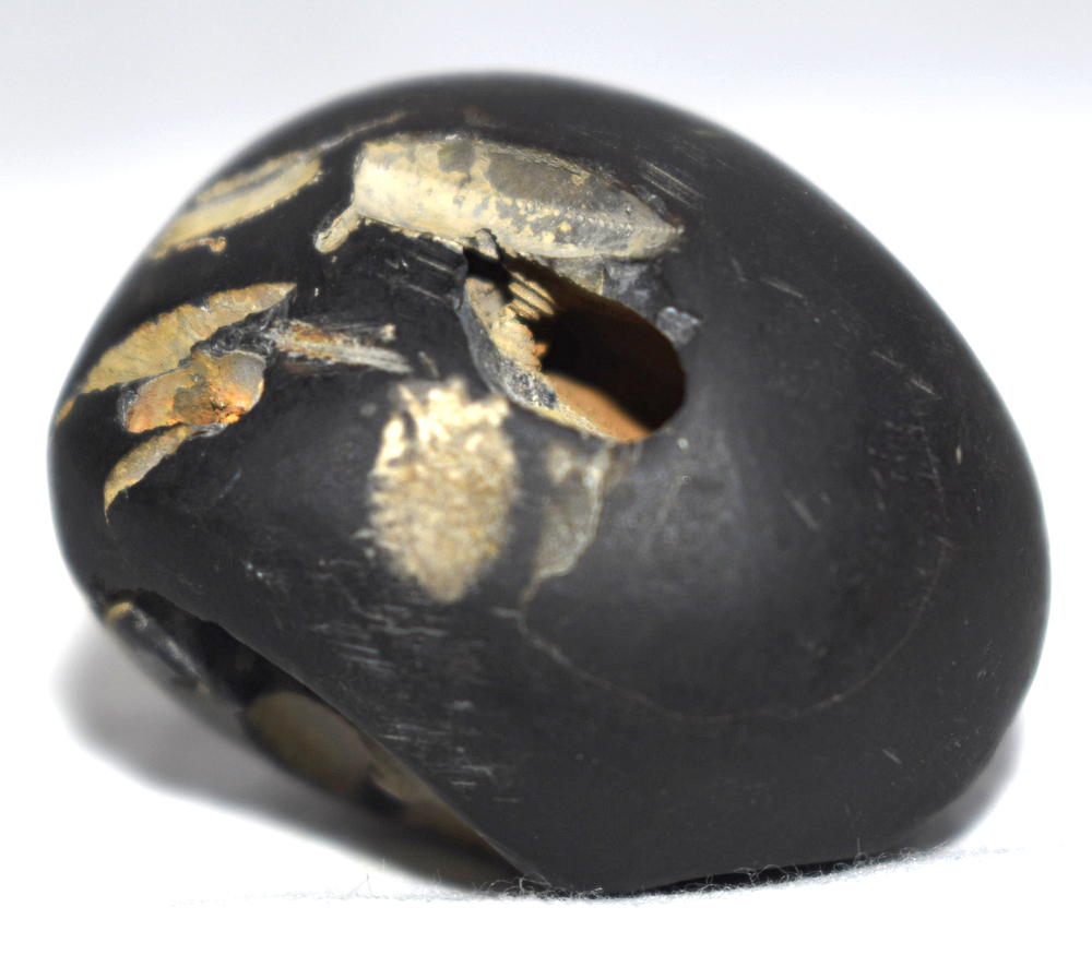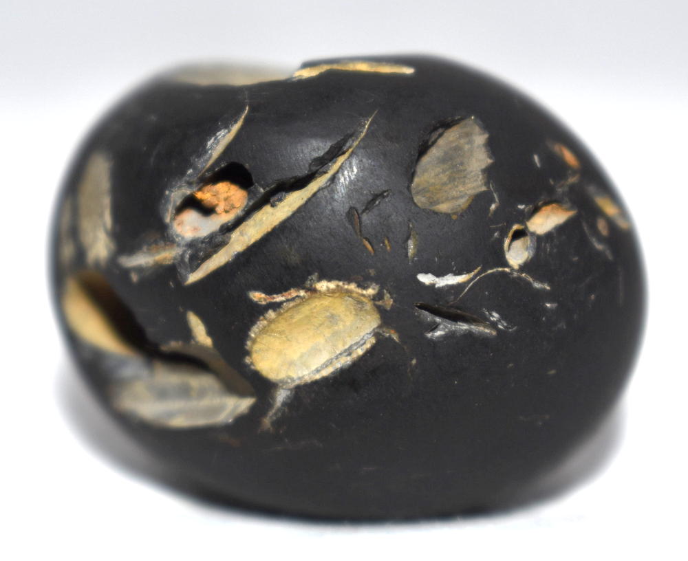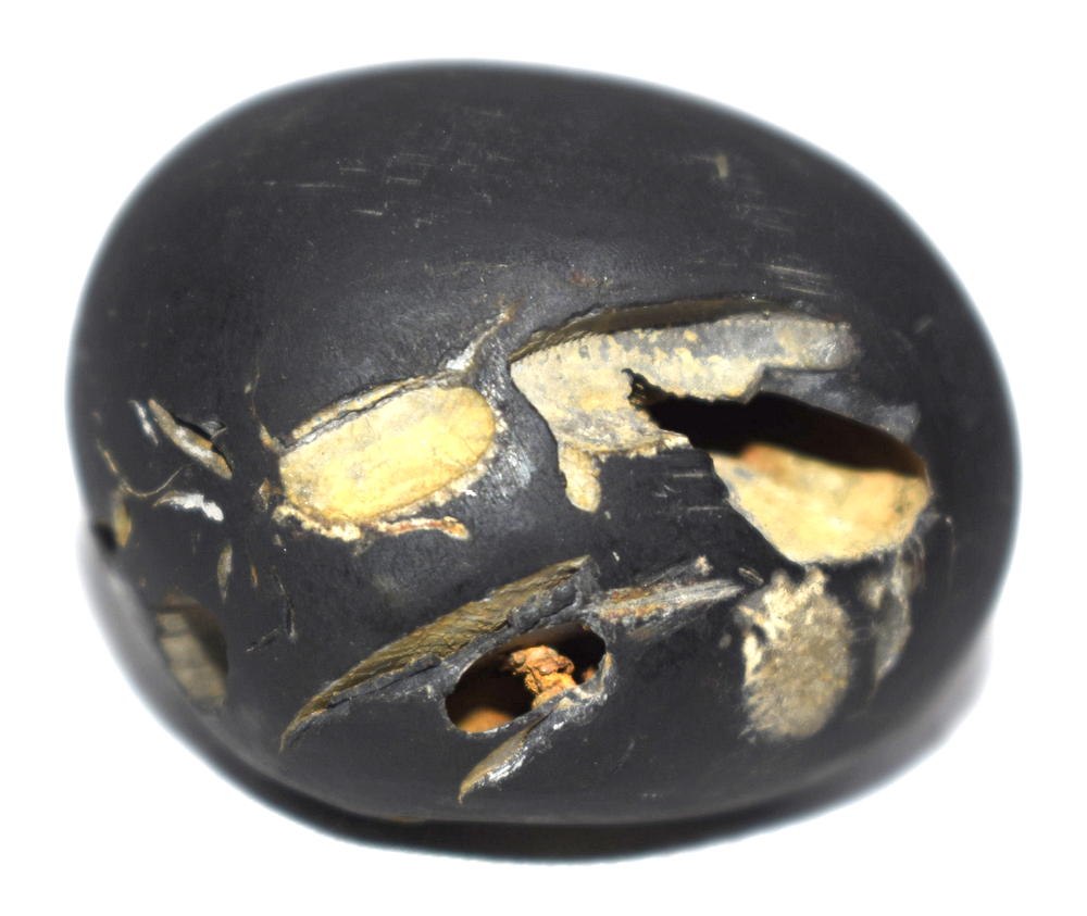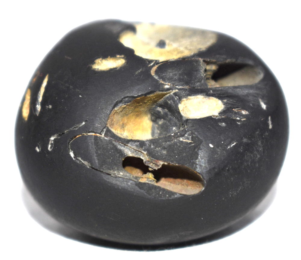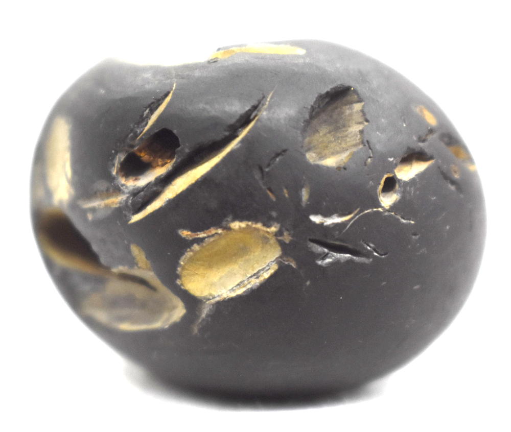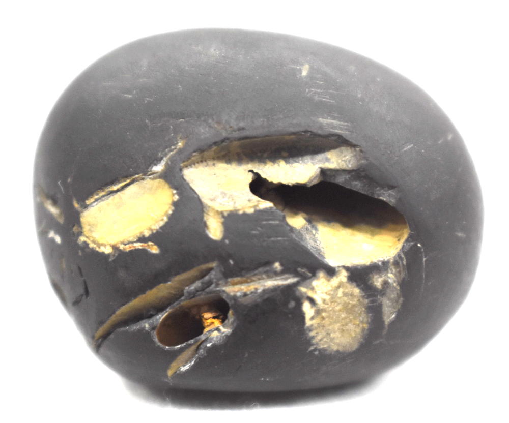Shaligram having 4 opening 8 chakras; one top side chakra; cold to touch; lines; black color; stable seat; shanka and mace, bow and arrow signs; 4 opening – 8 chakras with single chakra on top is known as Vishvaksena Shaligram .