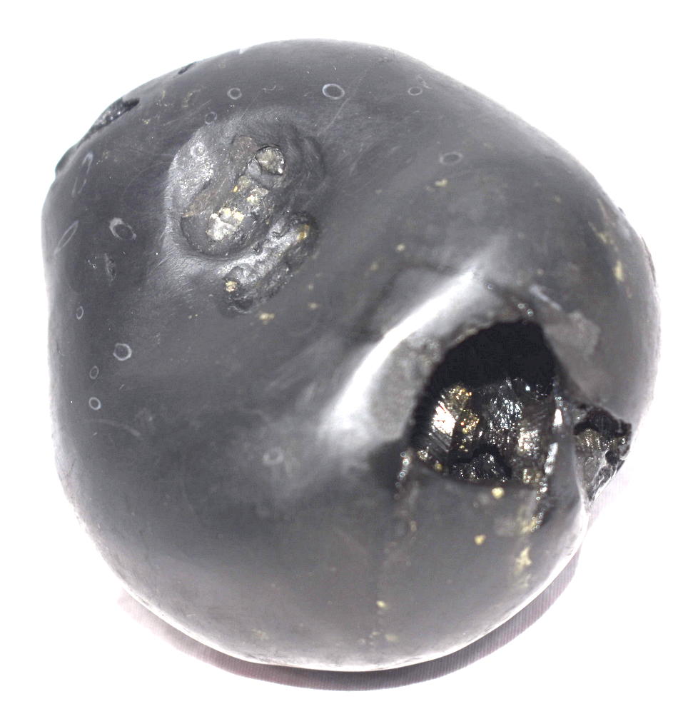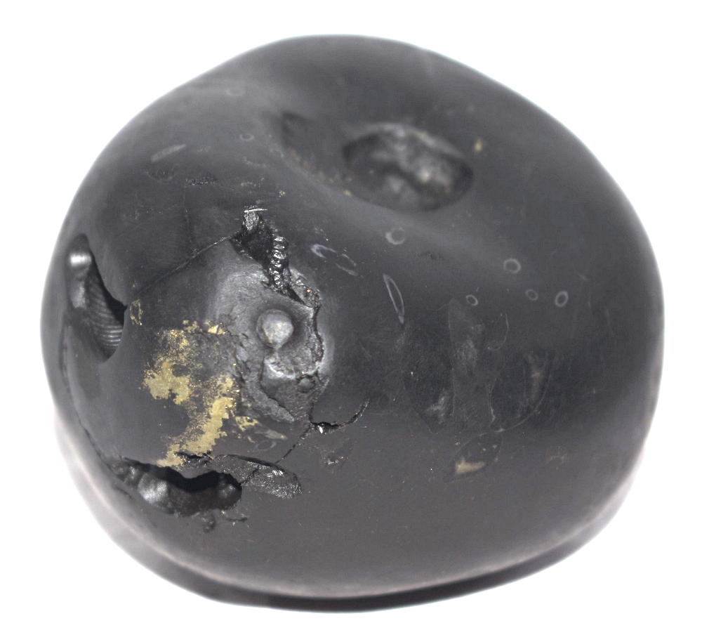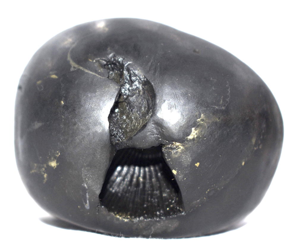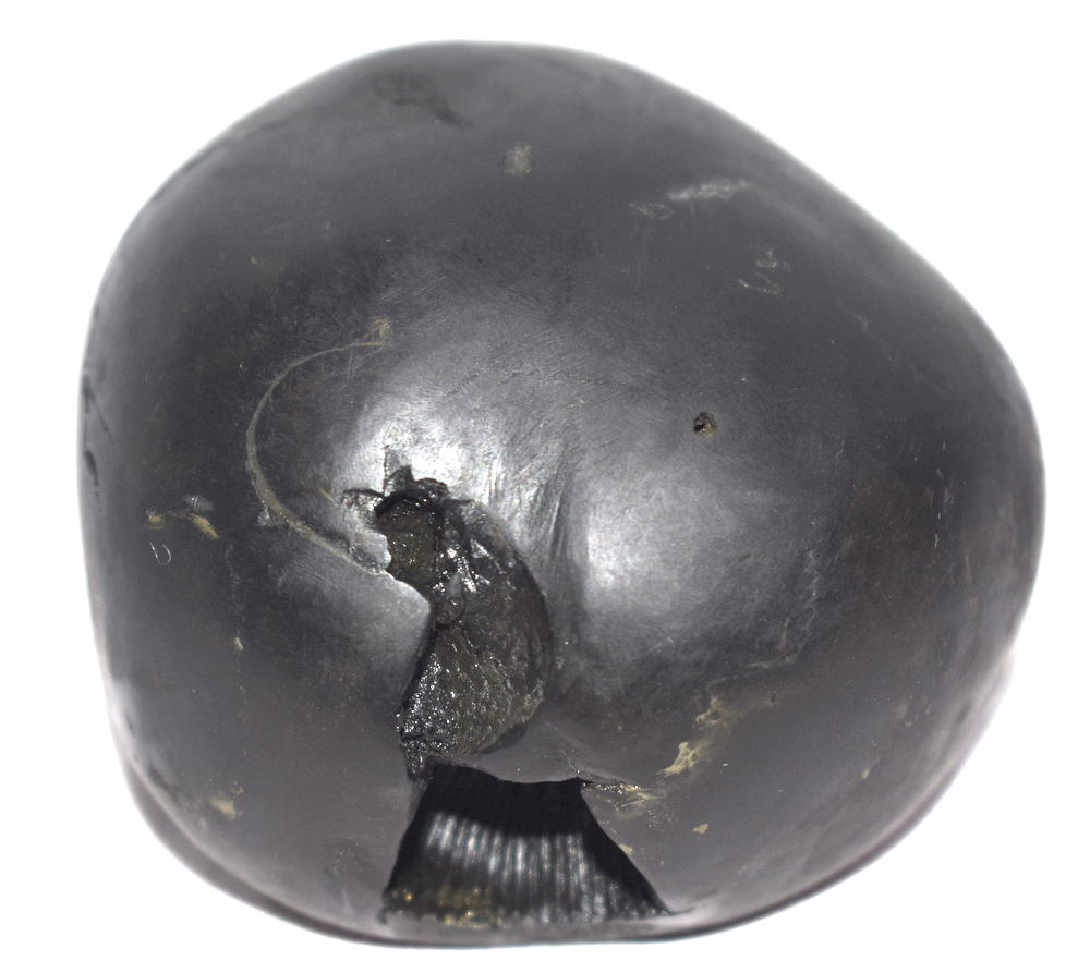 Shaligram having 4 opening 8 chakras; one top side chakra; cold to touch; lines; black color; stable seat; shanka and mace, bow and arrow signs; 4 opening – 8 chakras with single chakra on top is known as Vishvaksena Shaligram .